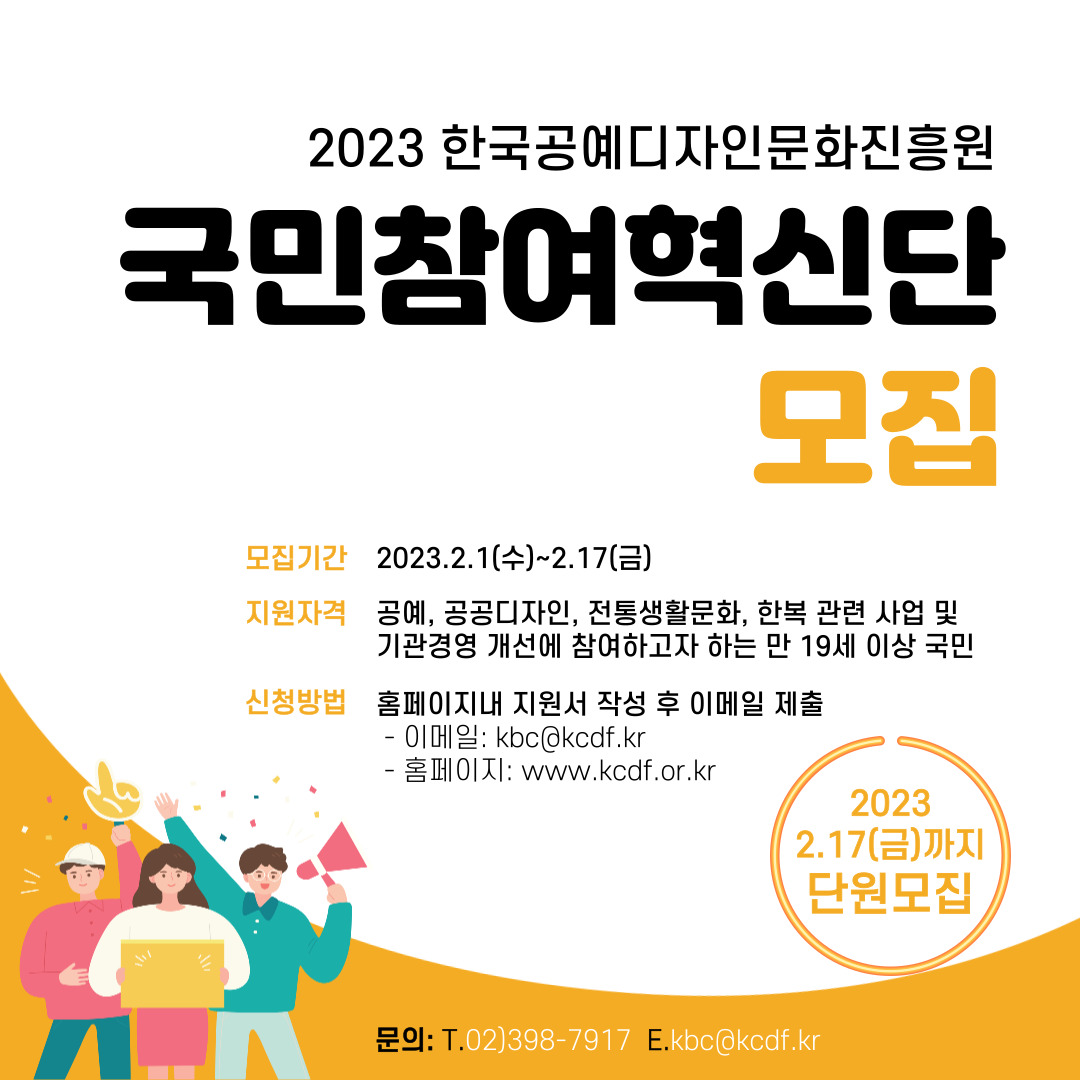 ◎ 사 업 명: 2022년 한국공예디자인문화진흥원 국민참여혁신단 모집 ◎ 모집기간: 2023.2.1.(수). ~ 2.17(금) ◎ 선발인원: 총 20명 내외 ◎ 신청자격: 공예‧공공디자인‧전통생활문화‧한복관련 사업 및 기관 업무 개선에 참여하고자 하는 만 19세 이상 국민 ◎ 신청방법: 홈페이지내 지원서 및 개인정보 수집 및 이용동의서 작성 후 이메일(kbc@kcdf.kr) 제출 ※ 이메일 제목: 2023 국민참여혁신단 지원서 제출_○○○