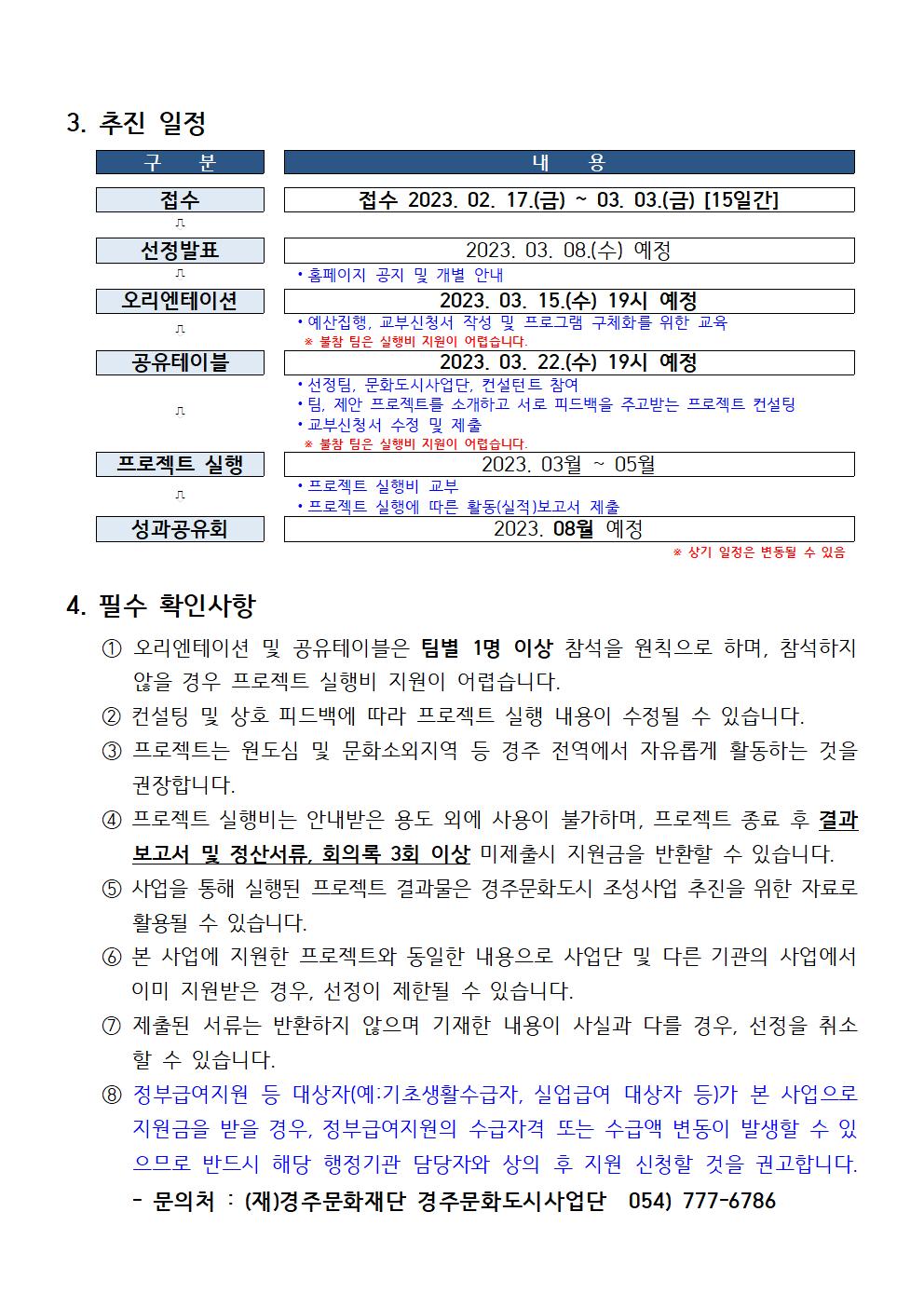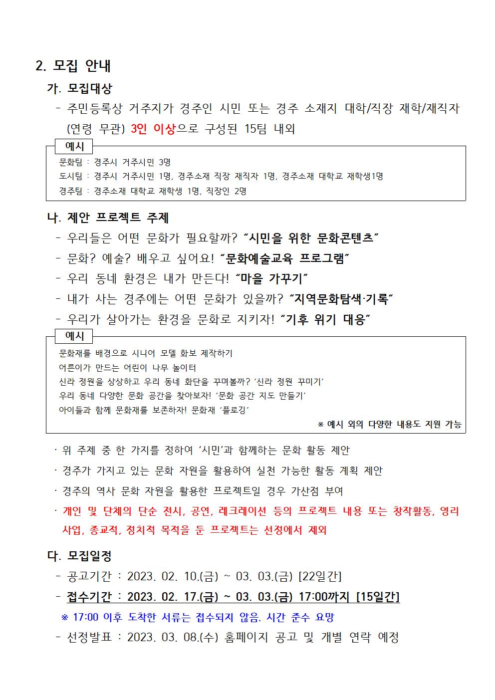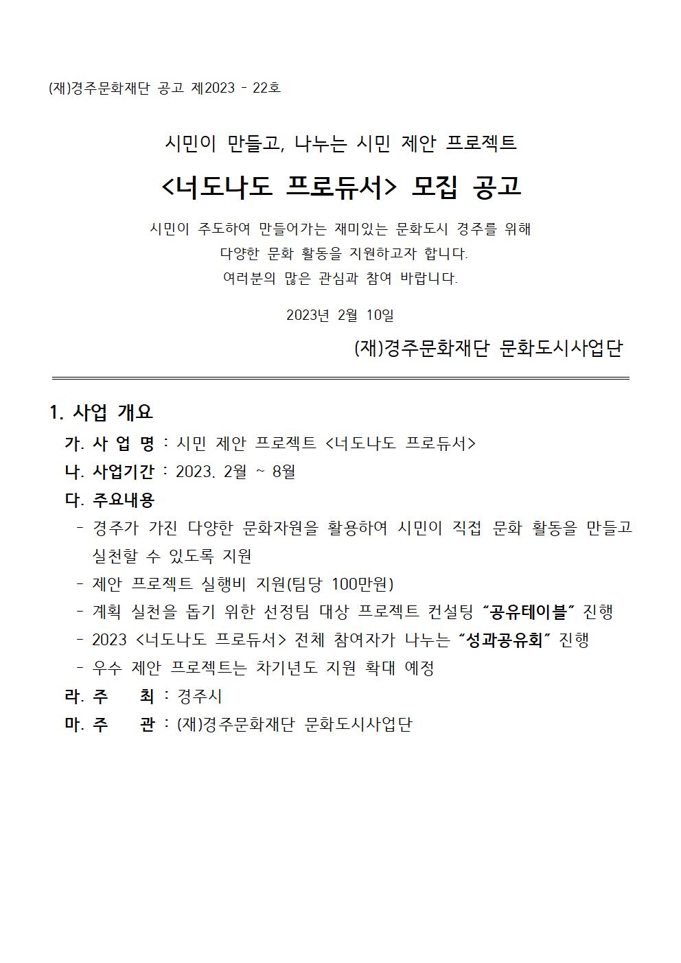 | 분야·대상 | 주민등록상 거주지가 경주인 시민 또는 경주 소재지 대학/직장 재학/재직자(연령무관) | 인원 | 3인 이상으로 구성된 15팀 내외 |
