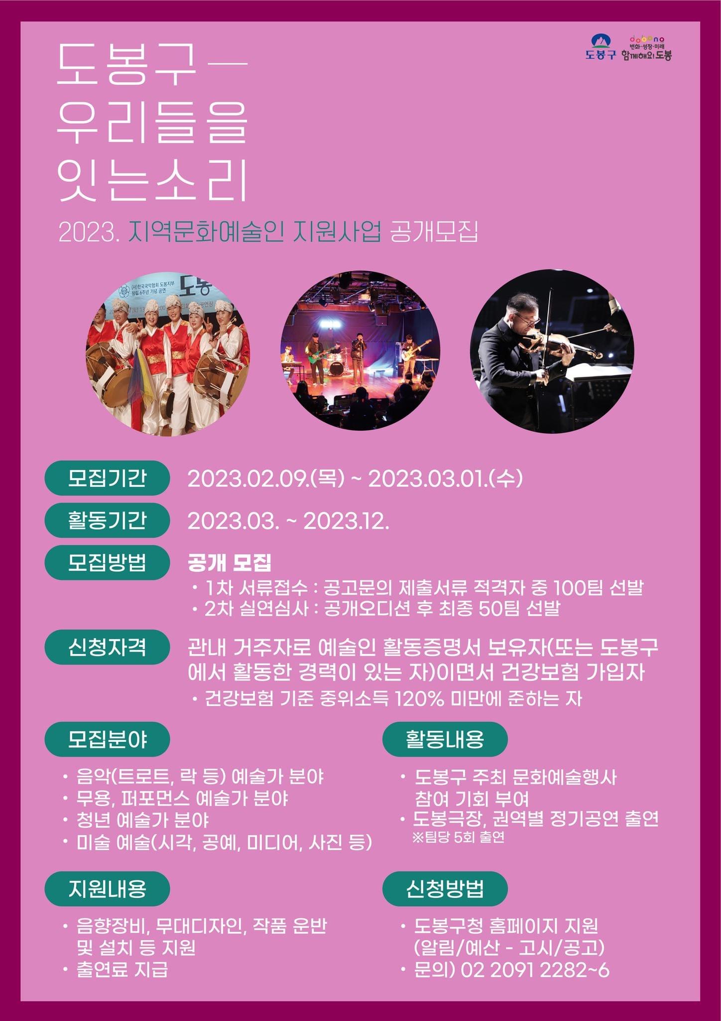 ![]() 「2023. 우리들을 잇는 소리」사업 참여자(지역예술인 공연, 미술 전시 분야 등)를 다음과 같이 모집 공고하고자 합니다. 1. 사업명: 「2023. 우리들을 잇는 소리」 2. 활동기간: 2023. 3. ∼ 12. 3. 내 용 - 대 상: 관내 거주자로 예술인 활동 증명서 보유자(또는 도봉구에서 활동한 경력이 있는 자)이면서 건강보험 가입자로 본 사업에 선발된 자 ※ 건강보험 기준 중위소득 120%미만에 준하는 자 4. 모집인원: 총 50팀(장르별 팀 배정) ※ 요건 미충족시 50팀 미만 선발될 수 있음 5. 모집분야: 음악(트로트, 락 등)예술가 분야, 무용·퍼포먼스 예술가 분야, 청년 예술가 분야, 미술(시각·공예·미디어·사진 등) 전시 예술가 분야 등 6. 선정방법: 1차 서류심사, 2차 실연심사 ※ 미술 분야는 포트폴리오 제출로 실연심사 대체 7. 지원내용 - 도봉구 주최 문화예술행사 참여 기회 부여 - 도봉극장(목요일), 권역별 정기 공연 출연 - 음향 장비, 무대 디자인, 작품 운반 및 설치 등 지원, 출연료 지급 8. 제출서류 (공통) - 참가 신청서 및 개인정보 수집 및 이용·자료공개 동의서 각 1부 - 예술인 활동증명서 1부 또는 도봉구에서 활동했음을 증빙할 수 있는 서류(경력증명서, 공연사진 등) 1부 - 도봉구 주민이거나 사업장 종사자임을 증명하는 서류(주민등록등본 또는 재직증명서) 1부 ※등본은 필수입니다 - 건강보험료 납부 확인서(2022년) (미술) - 포트폴리오 및 간단한 자기소개서(양식 및 분량 자율) 9. 문의처: 문화체육과(02-2091-2282~6)