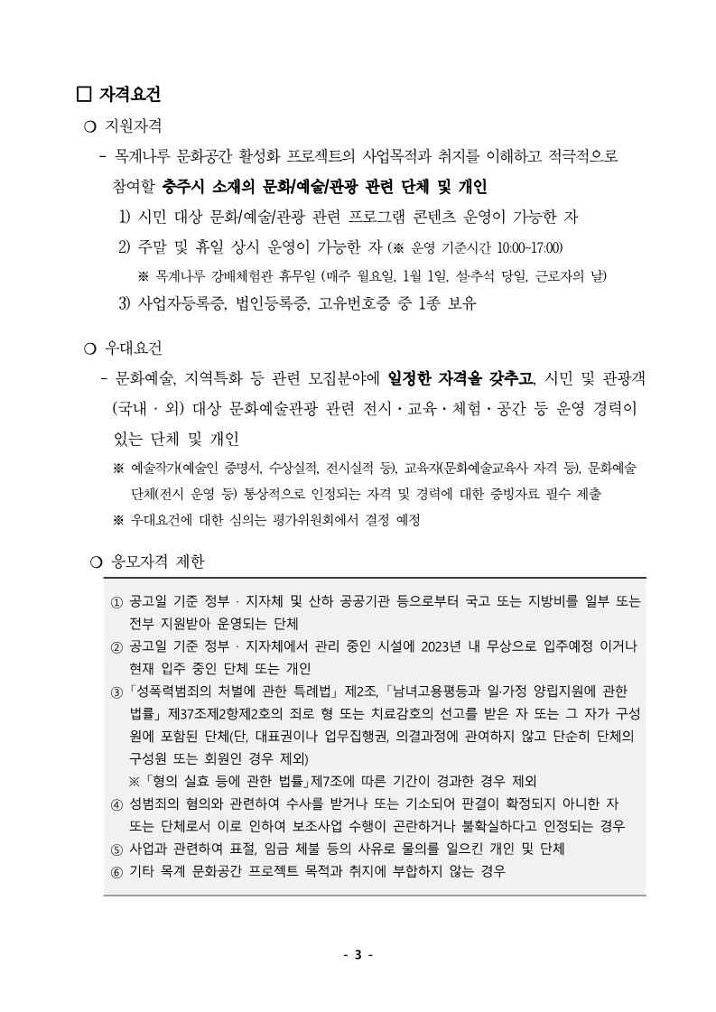 | 분야·대상 | 충주시 소재의 문화/예술/관광 관련 단체 및 개인 | 인원 | - |