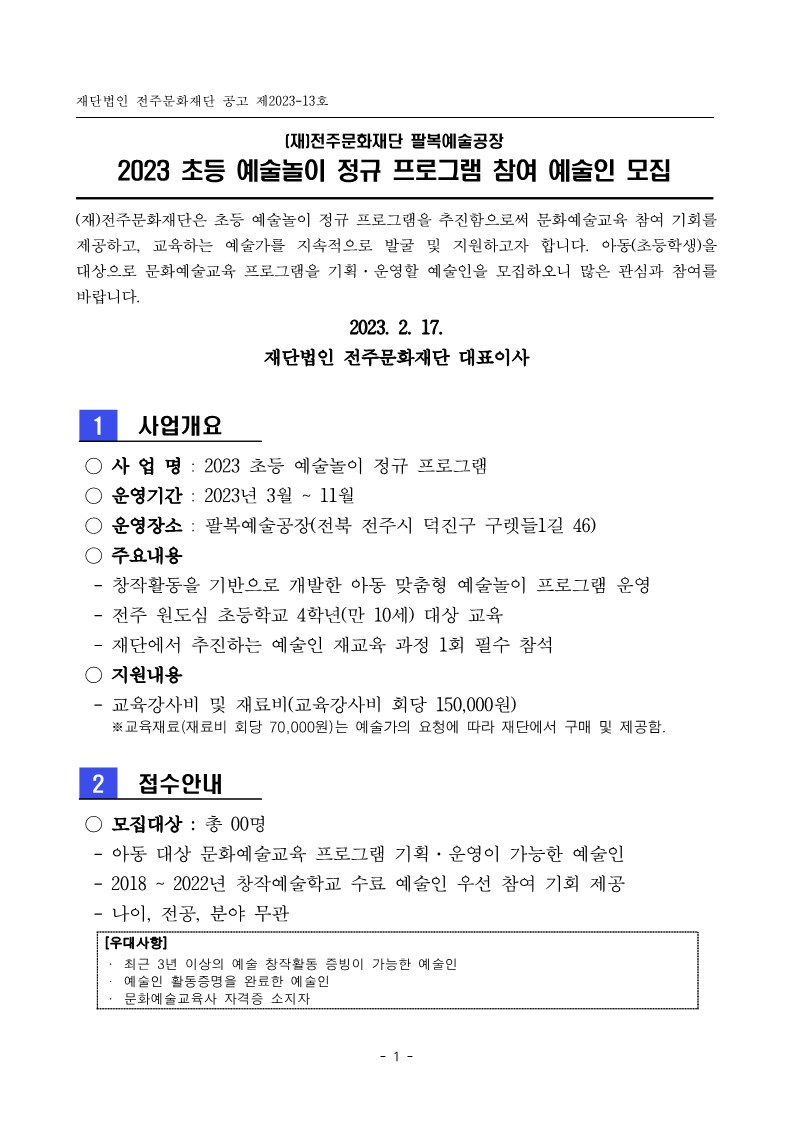 | 2023 초등 예술놀이 정규 프로그램 참여 예술인 모집(~3.3) | |||
