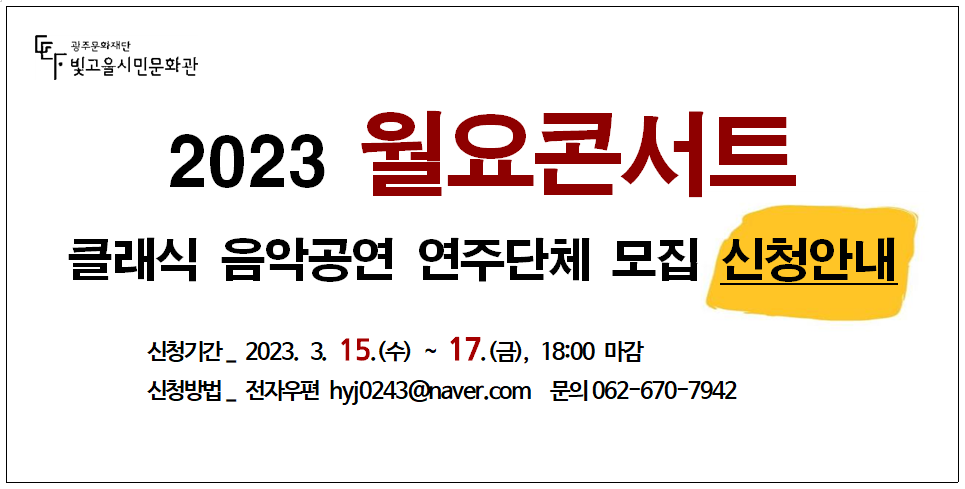 ![]() (재)광주광역시 광주문화재단 공고 제2023-34호 2023 월요콘서트 출연단체 모집 공고 (재)광주광역시 광주문화재단은 공연예술분야의 창작의욕 고취 및 시민의 문화 향유권 신장을 위하여 2023년 ‘월요콘서트’를 함께 만들어갈 공연단체를 모집하오니 광주지역 전문 예술인 및 예술단체의 많은 관심과 참여 바랍니다.