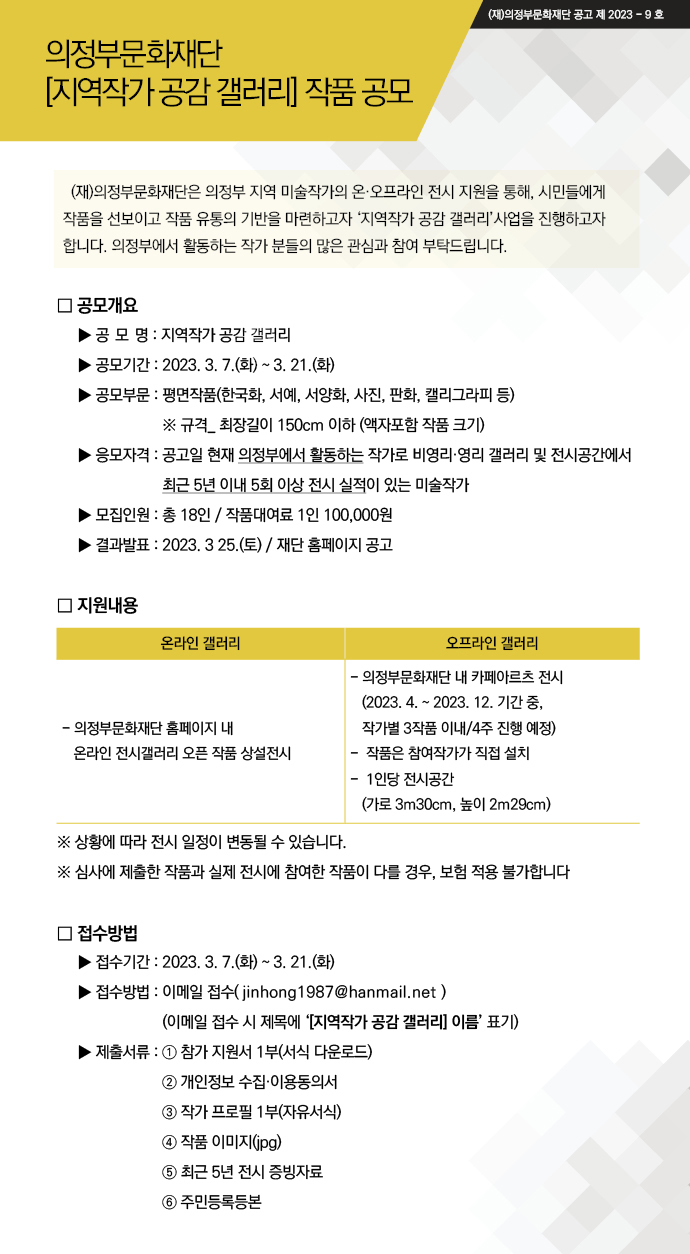 | 의정부문화재단 [지역작가 공감 갤러리] 작품 공모 (~3/21) | |||
