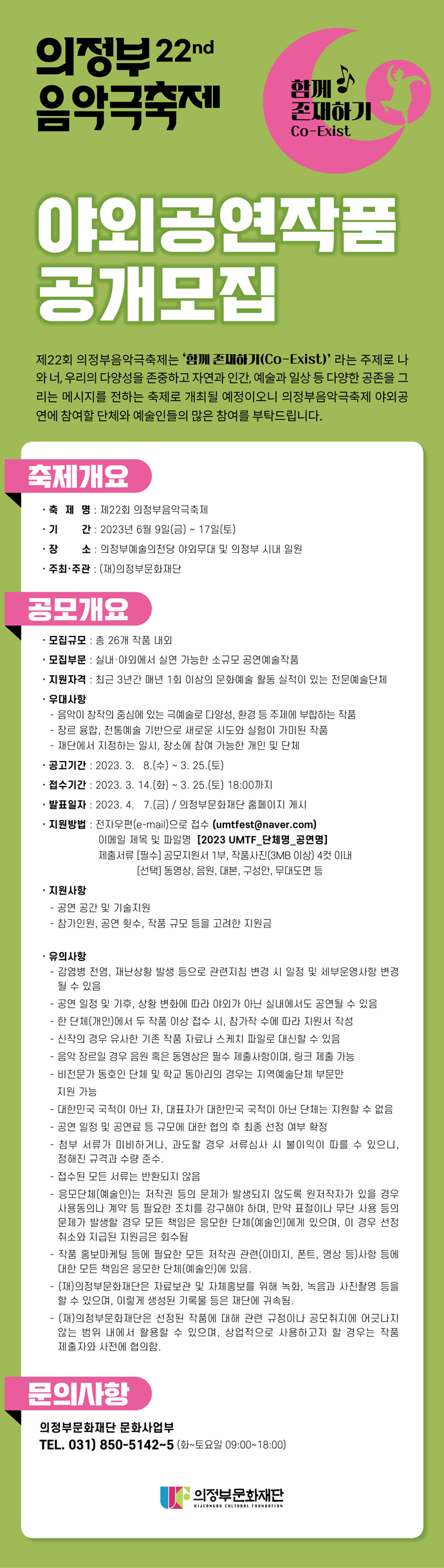 | [제22회 의정부음악극축제] 야외공연작품 공개모집 (~3/25) | |||