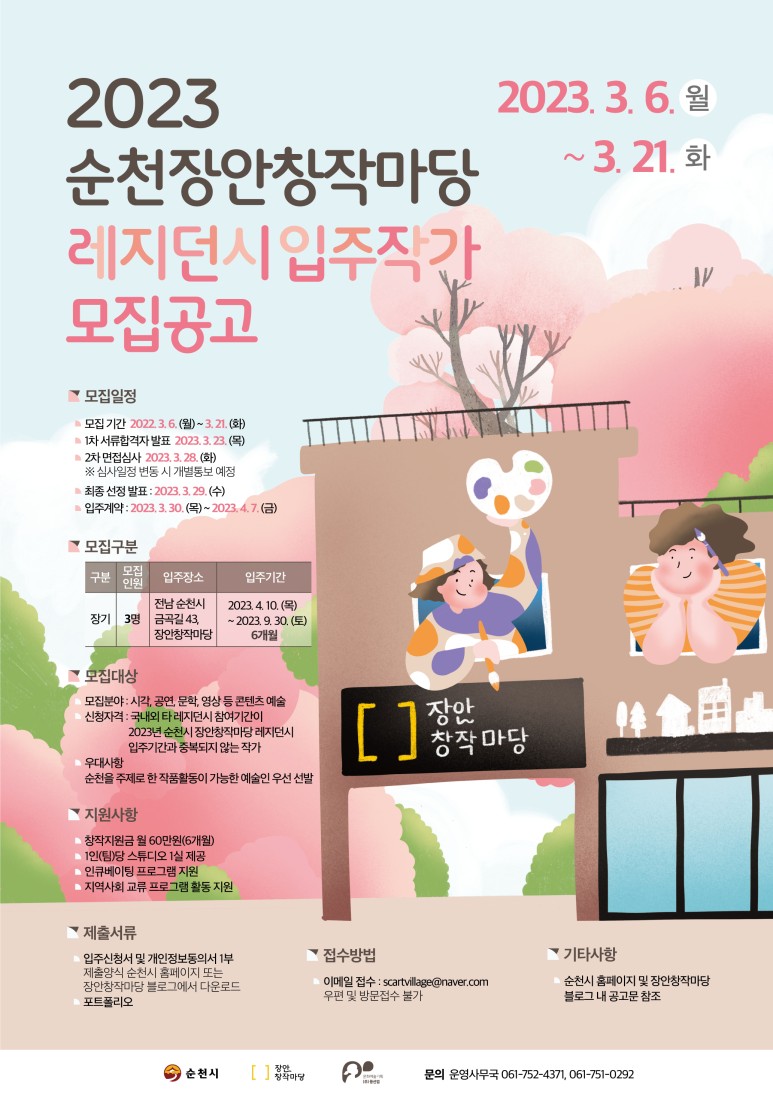 문의처 ❍ 순천 장안창작마당 운영사무국 061-752-4371 ※ 신청 접수는 e-mail(scartvillage@naver.com)로만 접수 받으며, 별도의 우편접수나 방문접수는 받지 않습니다.