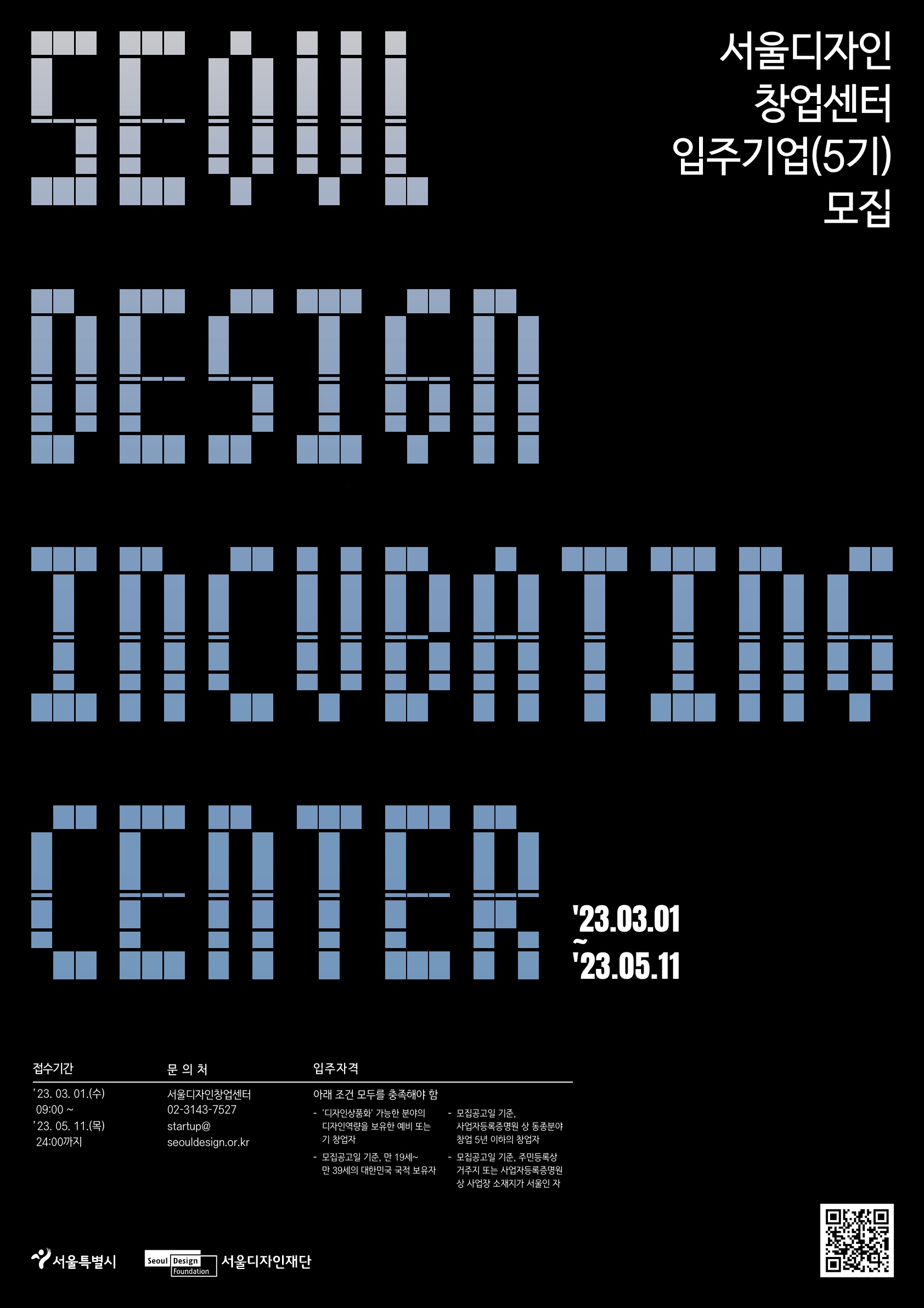■ 문의처 - 서울디자인재단 서울디자인창업센터 운영사무실 : 02-3143-7527 ※ 전화문의는 월~금(공휴일 제외) 09:00~18:00 - 이메일 : startup@seouldesign.or.kr