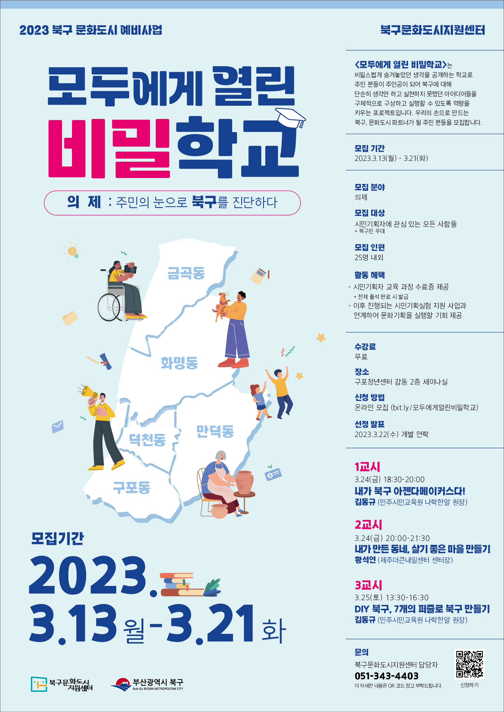 2023 북구 문화도시 예비사업 <모두에게 열린 비밀학교>는 비밀스럽게 숨겨놓았던 생각을 공개하는 학교로 주민 분들이 주인공이 되어 북구에 대해 단순히 생각만 하고 실현하지 못했던 아이디어들을 실행할 수 있도록 역량을 키우는 프로젝트입니다.