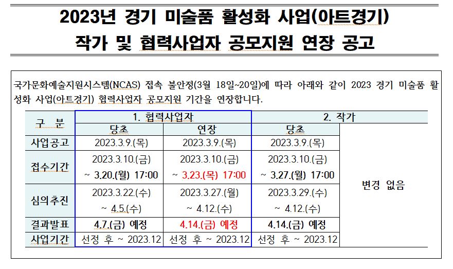 | [기간연장] 2023년 경기 미술품 활성화 사업(아트경기)작가 및 협력사업자 공모지원 연장 공고 | |||