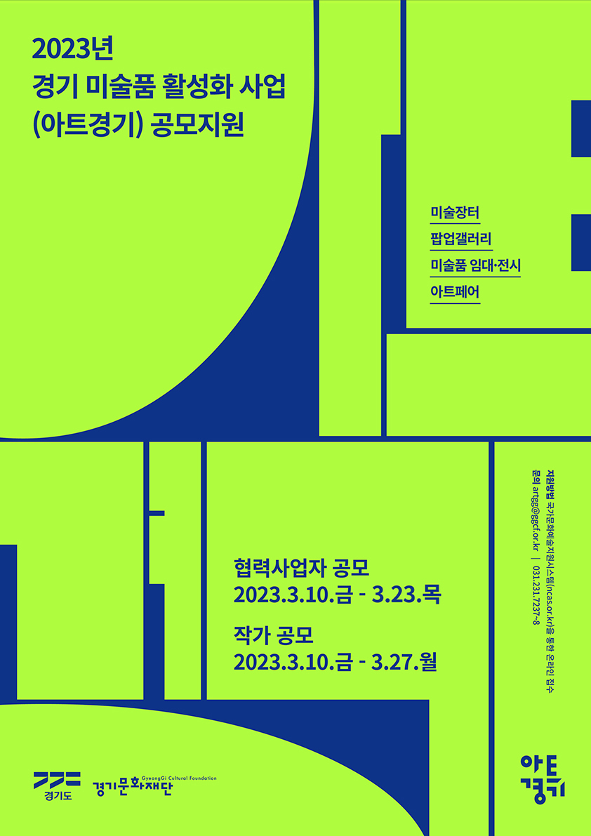 2023년 경기 미술품 활성화 사업(아트경기)은 예술가가 자립할 수 있는 창작환경을 조성하기 위하여 경기도와 경기문화재단이 지원하는 사업입니다. 이번 지원 사업은 경기도 미술품 유통활성화 및 지원에 관한 조례 제 4조에 근거, 미술시장의 주요 구성원인 예술가와 전문 유통사업자를 동시에 조명합니다. 한국 미술이 전 세계적으로 재조명되고 있는 오늘날, 아트경기와 함께 새로운 활력을 불어넣을 수 있기를 바랍니다.■경기문화재단 ▶ 공고 바로가기 : https://www.ggcf.kr/boards/businessNotices/articles/16565