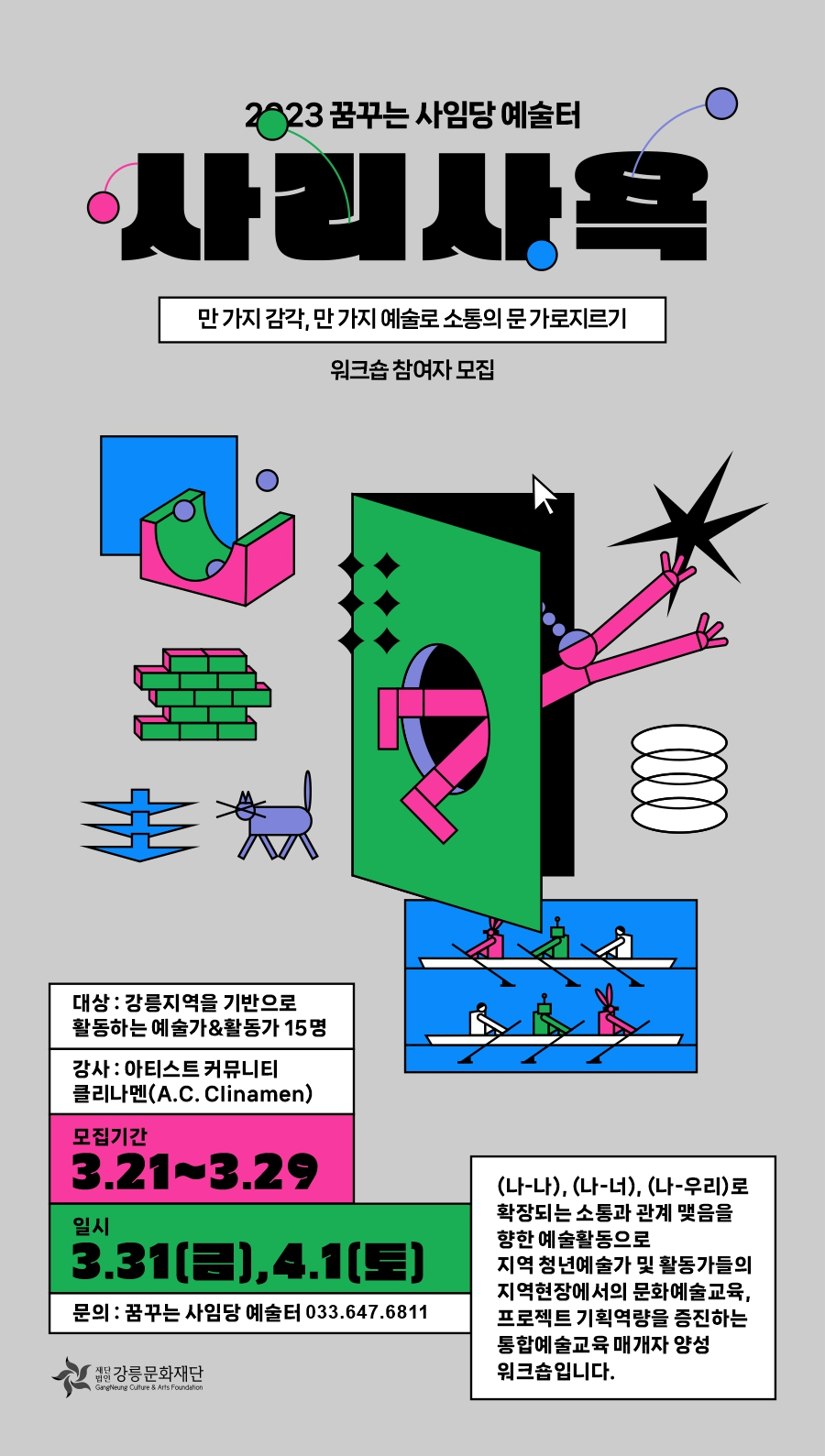 -강사 : 아티스트 커뮤니티 클리나멘(A.C. Clinamen) ──────────────────── 1일차 2023. 3. 31(금) 12:00~19:00 - 어떤 예술가의 ‘보기와 되기’ - 첫 번째 문 : 선언의 문을 만들고 가로지르기 - 손으로 소통하기, ‘너’를 감각하기 ──────────────────── 2일차 2023. 4. 1(금) 10:00~17:00 - 여기로부터 ‘소리’, ‘시’ - 예술로 삶, 장소를 만나는 일 - 두 번째 문 : 둥근 대화를 통해 만나는 ‘다시’ 선언문 ──────────────────── 여기, 강릉에서 이루는 문화예술교육 꿈꾸는 사임당 예술터에서 만나요!