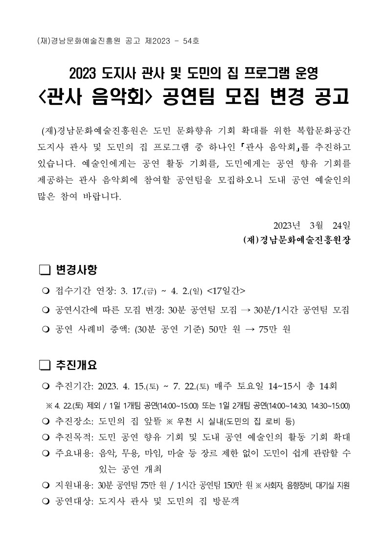 | 2023 도지사 관사 및 도민의 집 프로그램 운영 <관사 음악회> 공연팀 모집 변경 공고 | |||