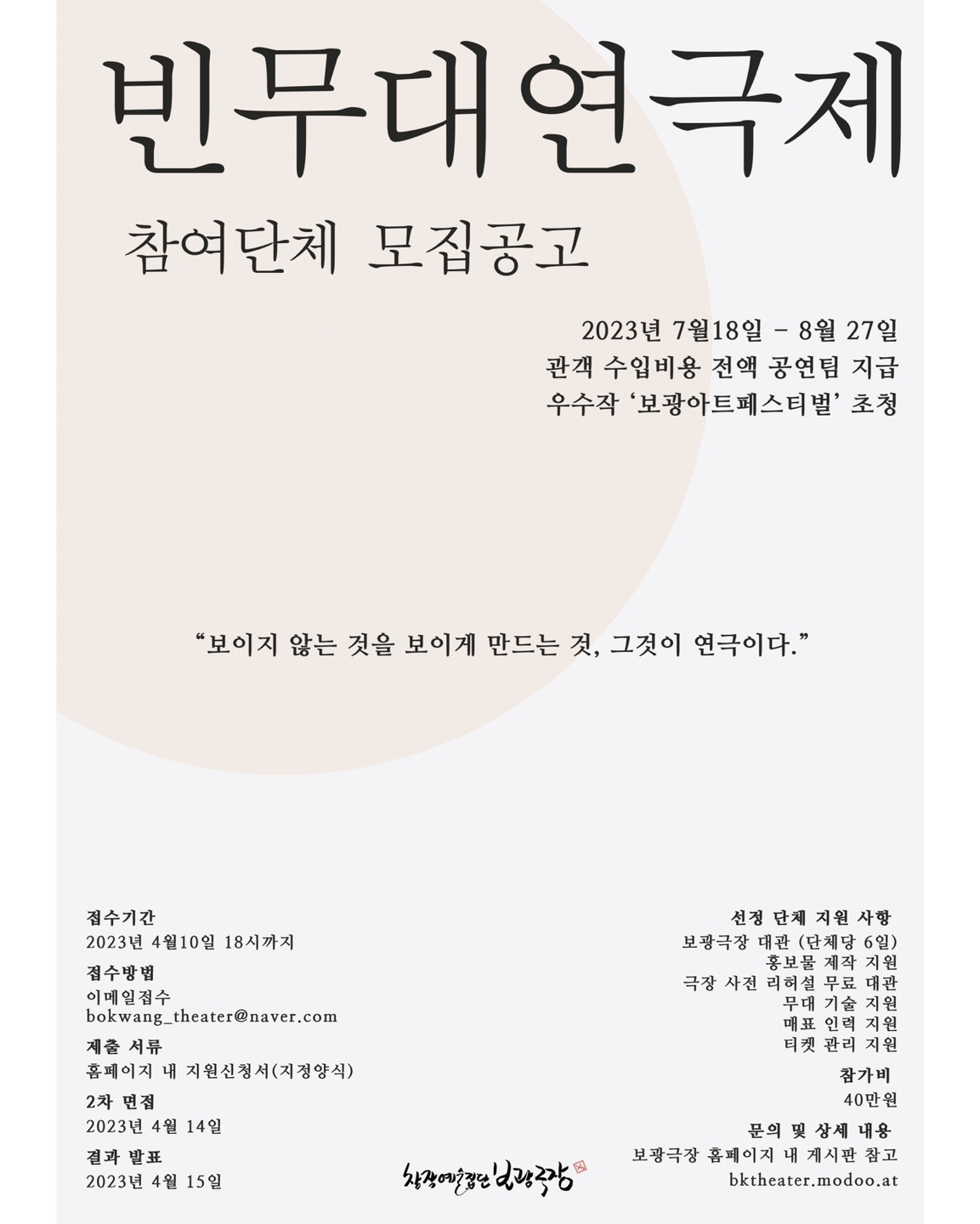 접수 기간 – 2023년 4월 10일 18:00까지 접수 방법 – 이메일 접수 이메일 – bokwang_theater@naver.com 제출 서류 – 1) 지원 신청서 (지정 양식) 2) 공연 대본 (상세한 시놉시스로 대체 가능) *지원 신청서 다운링크 https://drive.google.com/file/d/1vQcigXVUJ6Urg1WoEuT3fdTcnhOs59Na/view?usp=share_link