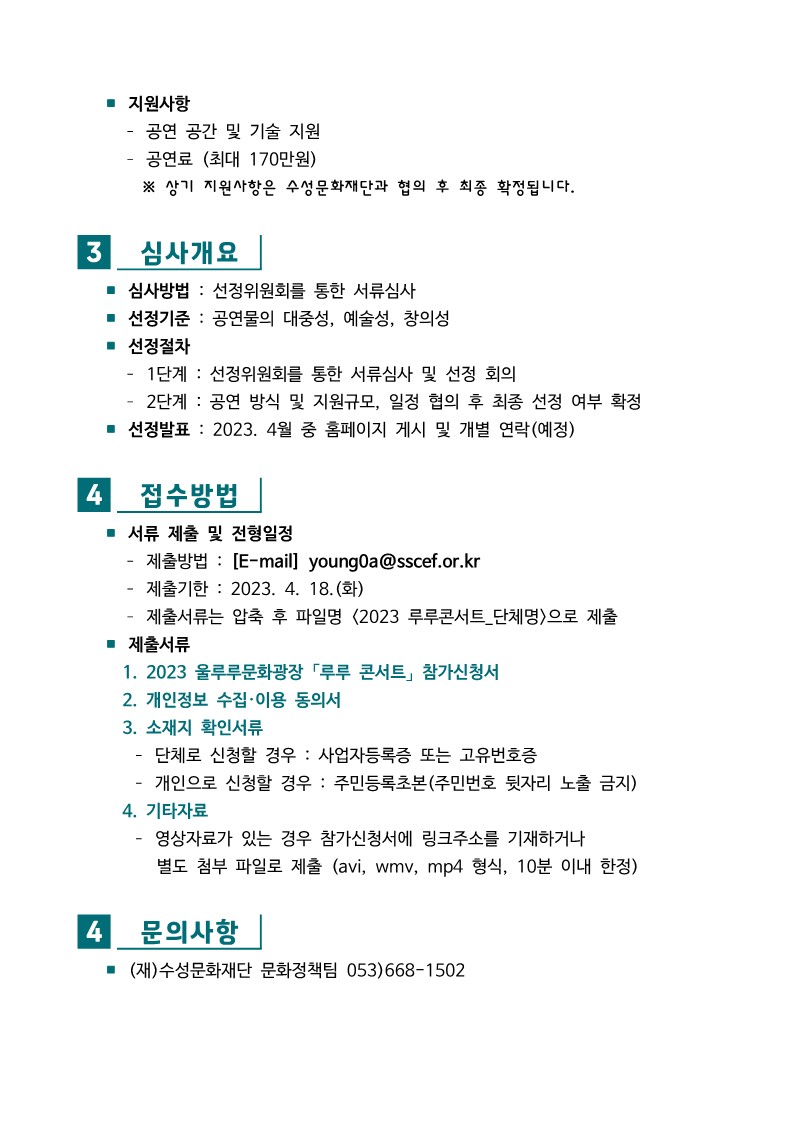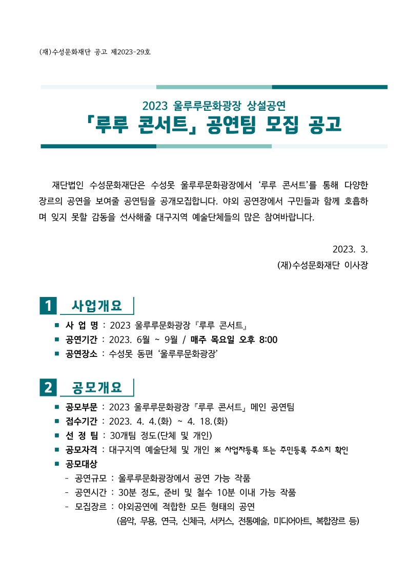 | 2023 울루루문화광장 「루루 콘서트」 공연팀 모집 공고 | |||