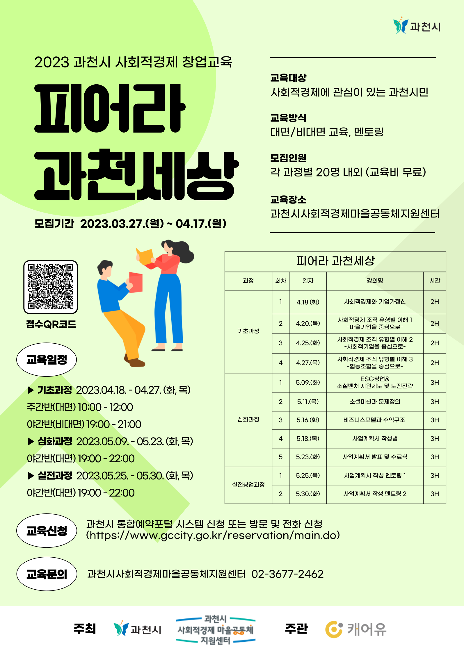 ![]() 1. 교육개요 ○ 신청기간 : '23.3.27.(월) ~ '23.4.17.(월) ○ 교육장소 : 과천시 사회적경제·마을공동체 지원센터(과천시민회관 2층) ○ 신청대상 : 사회적경제에 관심 있는 시민 ○ 교육방식 : 대면/비대면교육, 멘토링 ○ 모집인원 : 각 과정별 20명 내외(교육비 무료) ○ 신청방법 : 과천시 통합예약포털 시스템 신청 및 방문 또는 전화신청 ○ 교육문의 : 과천시 사회적경제·마을공동체 지원센터(02-3677-2462) 2. 교육일정 ○ 기초과정(주간반) : '23.4.18. ~ '23.4.27.(화,목) 10:00~12:00[주 2회 운영] ○ 기초과정(야간반) : '23.4.18. ~ '23.4.27.(화,목) 19:00~22:00[주 2회 운영] ○ 심화과정 : '23.5.9. ~ '23.5.23.(화,목) 19:00~22:00[주 2회 운영] ○ 실전과정 : '23.5.25. ~ '23.5.30.(화,목) 19:00~22:00[주 2회 운영] ※ 중복접수 가능 |