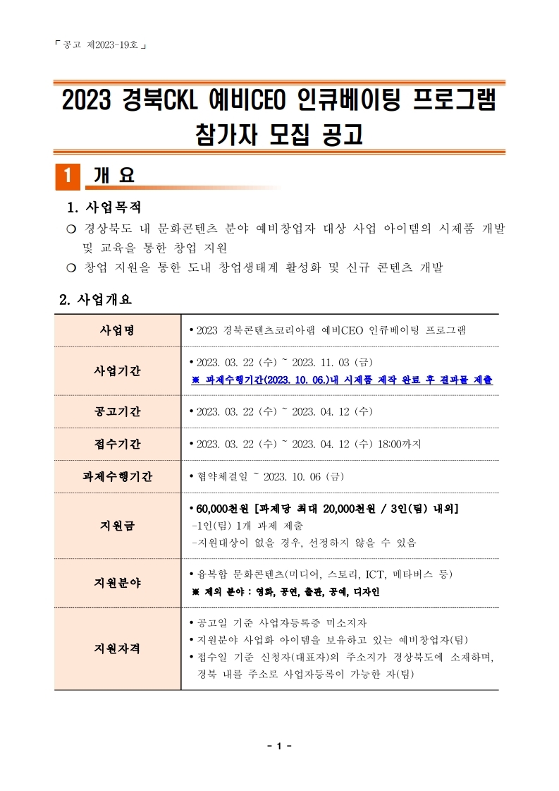 | 2023 경북CKL 예비CEO 인큐베이팅 프로그램 참가자 모집 | |||