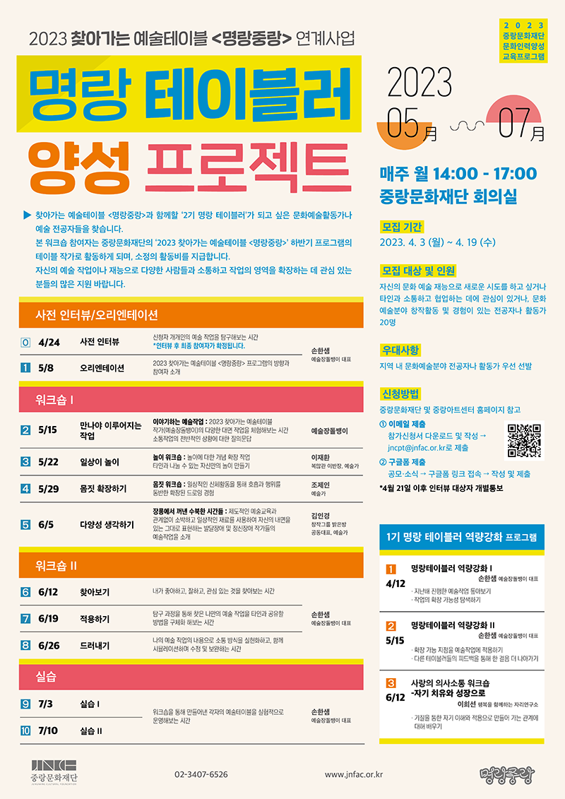 | 2023 찾아가는 예술테이블 〈명랑중랑〉 연계사업 '명랑 테이블러' 양성 프로젝트 참여자 모집 | |||