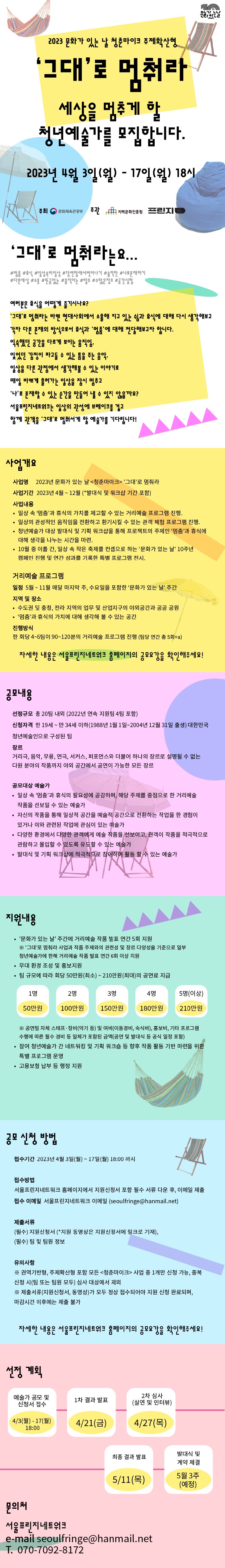 | 2023 문화가 있는 날 청춘마이크 <그대>로 멈춰라 청년예술가 공모 | |||
