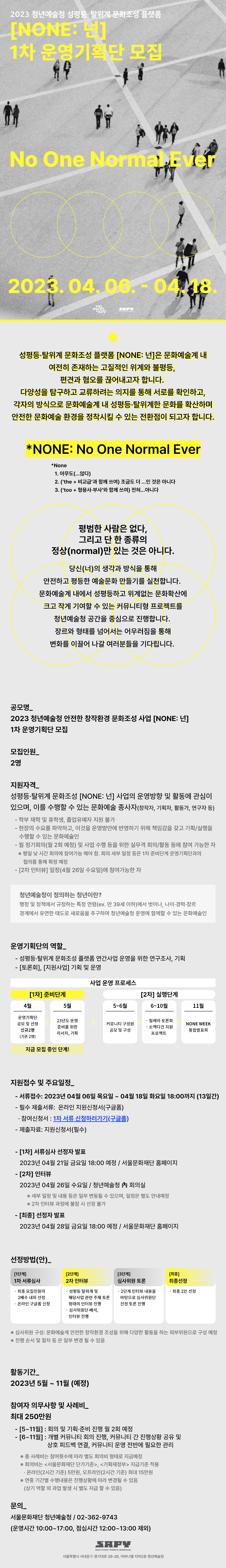 | 2023 청년예술청 성평등∙탈위계 문화조성 플랫폼 [NONE:넌] 1차 운영기획단 모집(~4.17까지 접수) | |||