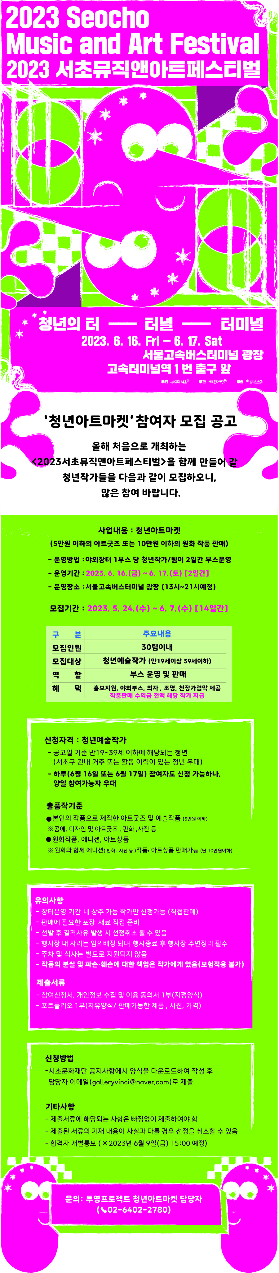 | ◈서초뮤직앤아트페스티벌 청년아트마켓 참여자 모집 공고◈ | |||