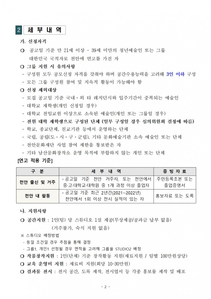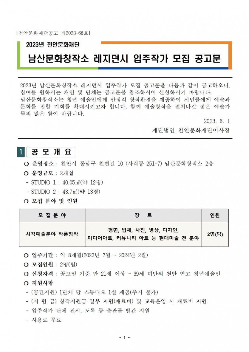 | 2023년 천안문화재단 남산문화창작소 레지던시 입주작가 모집 공고 | |||