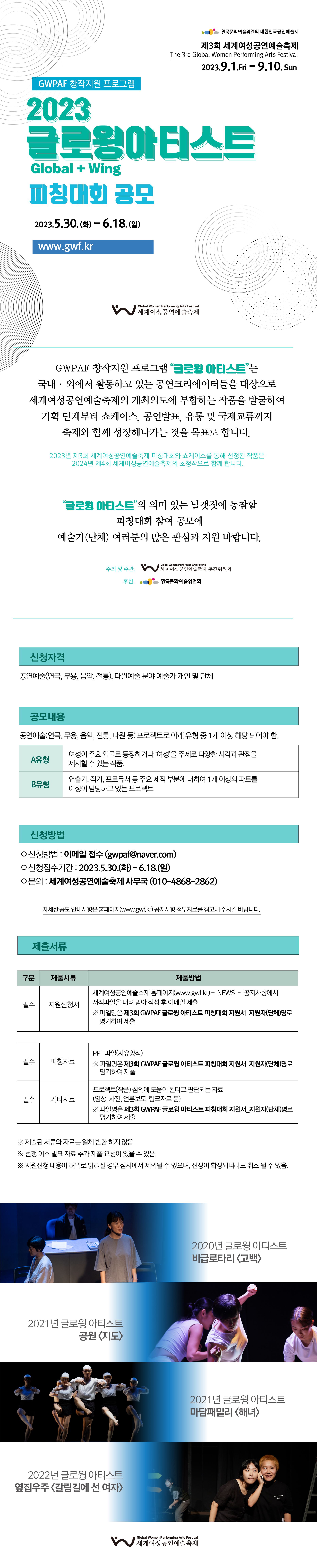 ![]() GWPAF 창작지원 프로그램 "2023 글로윙 아티스트 피칭대회 " 공모 안내 2023.5.30(화)~6.18(일) GWPAF 창작지원 프로그램 "글로윙 아티스트"는 국내/외에서 활동하고 있는 공연크리에이터들을 대상으로 세계여성공연예술축제의 개최의도에 부합하는 작품을 발굴하고 기획 단계부터 쇼케이스, 공연발표, 유통 및 국제교류까지 본 축제와 함께 성장해 나가는 것을 목표로 합니다. (* 2023년 제3회 세계여성공연예술축제 피칭대회와 쇼케이스를 통해 선정된 작품은 2024년 제4회 세계여성공연예술축제의 초청작으로 함께 합니다.) 글로윙 아티스트의 첫 번째 날개 짓 - 피칭대회 참가팀을 모집합니다. 예술가(단체) 여러분의 많은 관심과 지원바랍니다. * 자세한 공모내용은 첨부된 공모안내 파일을 참조해 주시길 바랍니다. *첨부자료 : 1. [공모안내] 2023년 제3회 GWPAF 글로윙 아티스트 피칭대회 공모 2. [서식] 2023년 제3회 GWPAF 글로윙 아티스트 피칭대회 지원신청서