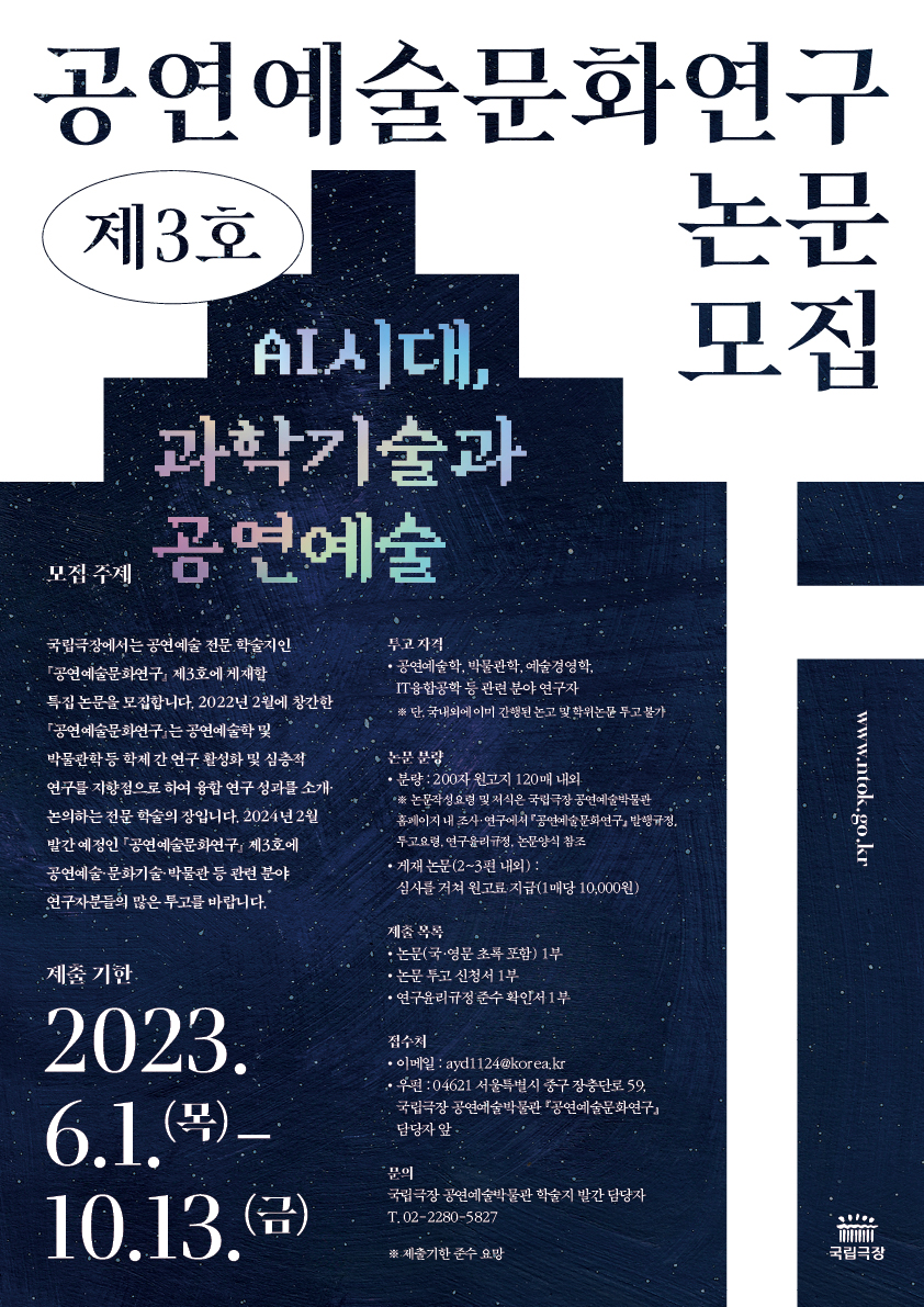 ![]() 국립극장 공연예술박물관은 공연예술·박물관·문화기술 등 학제 간 연구 활성화를 위해 전문 학술지 『공연예술문화연구』를 발간하고 있습니다. 『공연예술문화연구』제3호의 특집 주제 ‘AI시대, 과학기술과 공연예술’ 논문을 다음과 같이 모집합니다. 연구자분들의 많은 투고 바랍니다. 『공연예술문화연구』 제3호 특집 논문 모집 1. 모집주제: AI시대, 과학기술과 공연예술 2. 투고자격: 공연예술, 문화기술, 박물관, 예술경영 등 관련 분야 연구자 3. 원고기준: 200자 원고지 120매 내외 ※단, 국내외에 이미 간행된 논고 및 학위논문 투고 불가 ※ 심사를 거쳐 게재 확정된 논문에 원고료 지급. (1매당 10,000원) 4. 제출서류 ① 논문(국·영문 초록 포함) 1부 ② 논문 투고 신청서 1부 ③ 연구윤리규정 준수 확인서 1부 5. 제출기한: 2023년 6월 1일(목) - 2023년 10월 13일(금) 6. 접수처 이메일- ayd1124@korea.kr 우 편- (04621) 서울특별시 중구 장충단로 59, 국립극장 공연예술박물관 『공연예술문화연구』 담당자 앞 자세한 내용은 국립극장 홈페이지 공지사항(www.ntok.go.kr)을 참고하시기 바랍니다. ※문의: 국립극장 공연예술박물관 학술지 발간 담당자 (02-2290-5827)