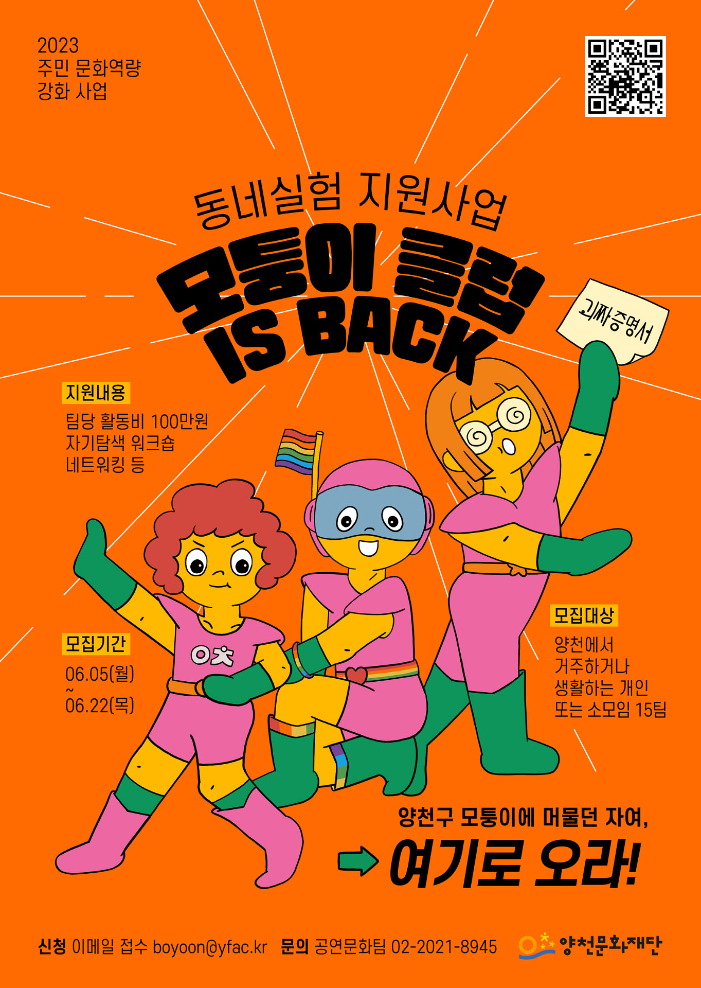| 분야·대상 | 양천에서 거주하거나 생활하는 개인 또는 소모임 | 인원 | 15팀 |