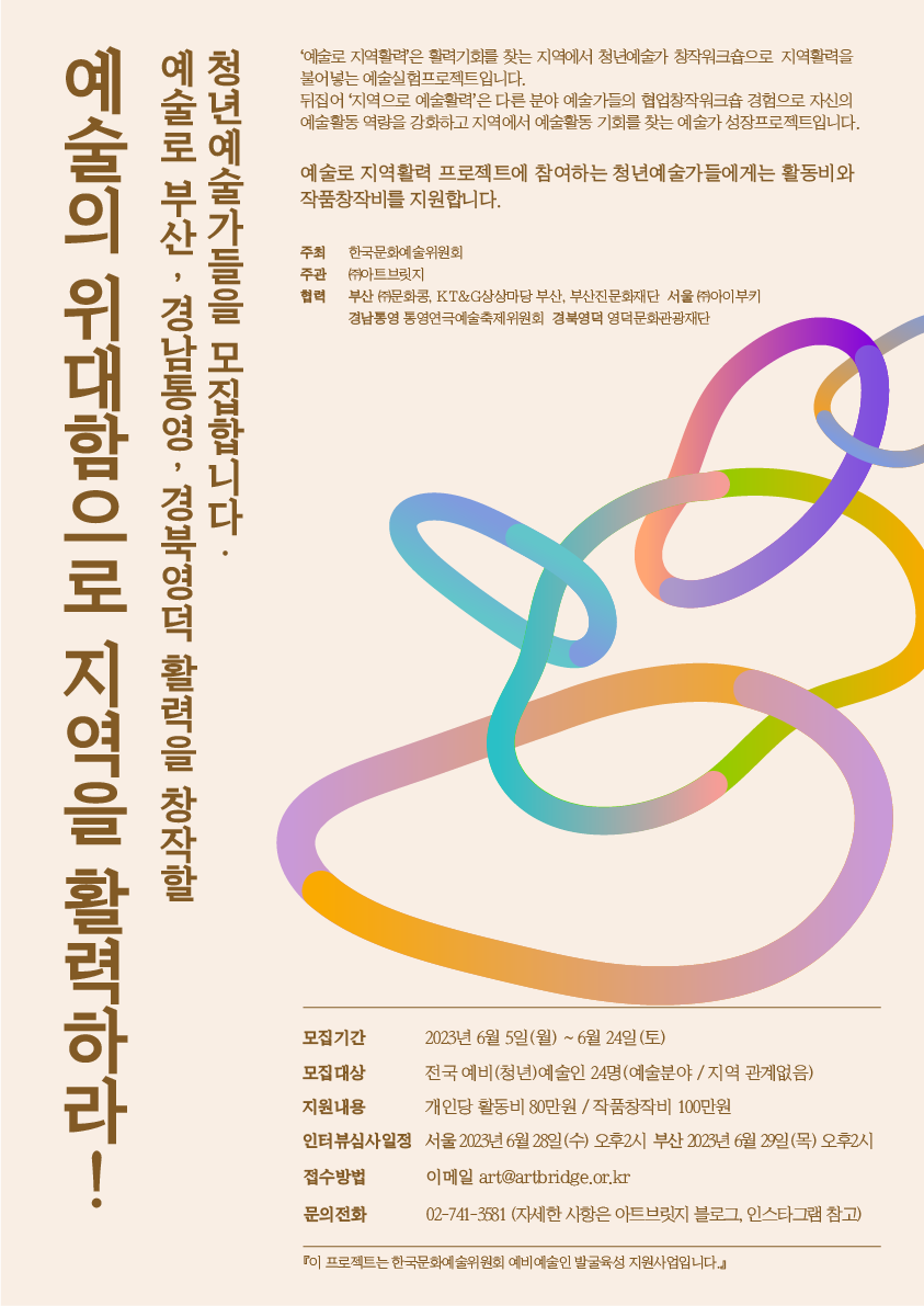 ![]() ▶ 모집안내 - 모집기간 : 2023년 6월 5일(월) ~ 6월 24일(토) - 모집대상 : 만 29세이하(1993.1.1. 이후 출생자) 예술인으로, 예술대학(원)생과 그외 예술관련 교육훈련을 받은 자