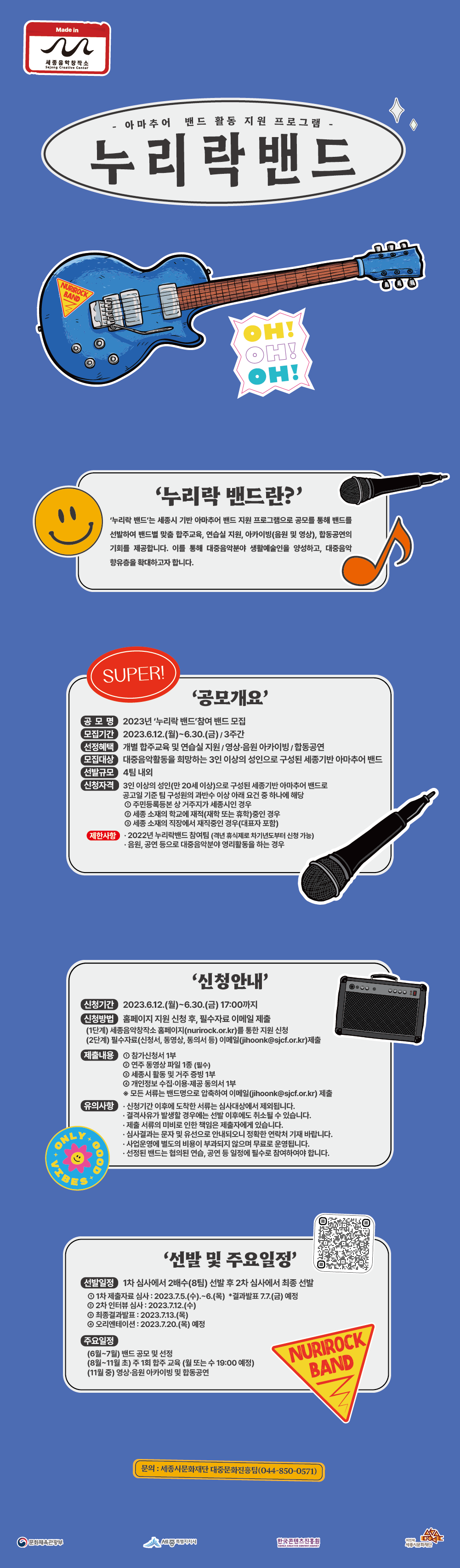 | 분야·대상 | 대중음악활동을 희망하는 3인 이상의 성인으로 구성된 세종기반 아마추어 밴드 | 인원 | 4팀 내외 |