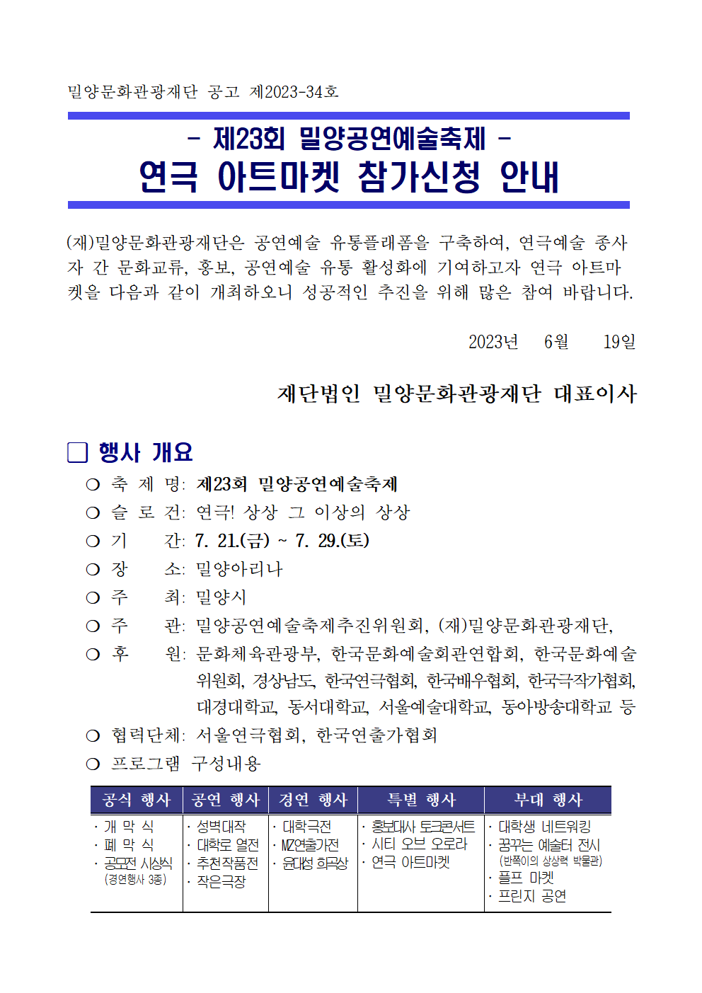 | 제23회 밀양공연예술축제 연극 아트마켓 참가신청 안내 | |||