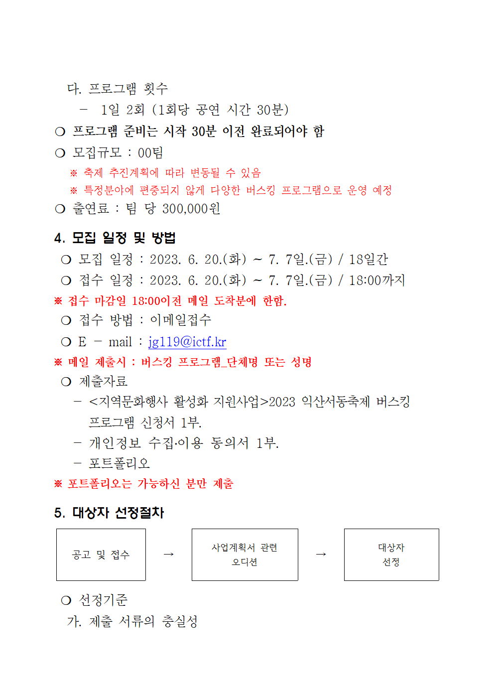 | jg119@ictf.kr | 전화번호 | 문화예술축제팀 070-5176-1496 | |