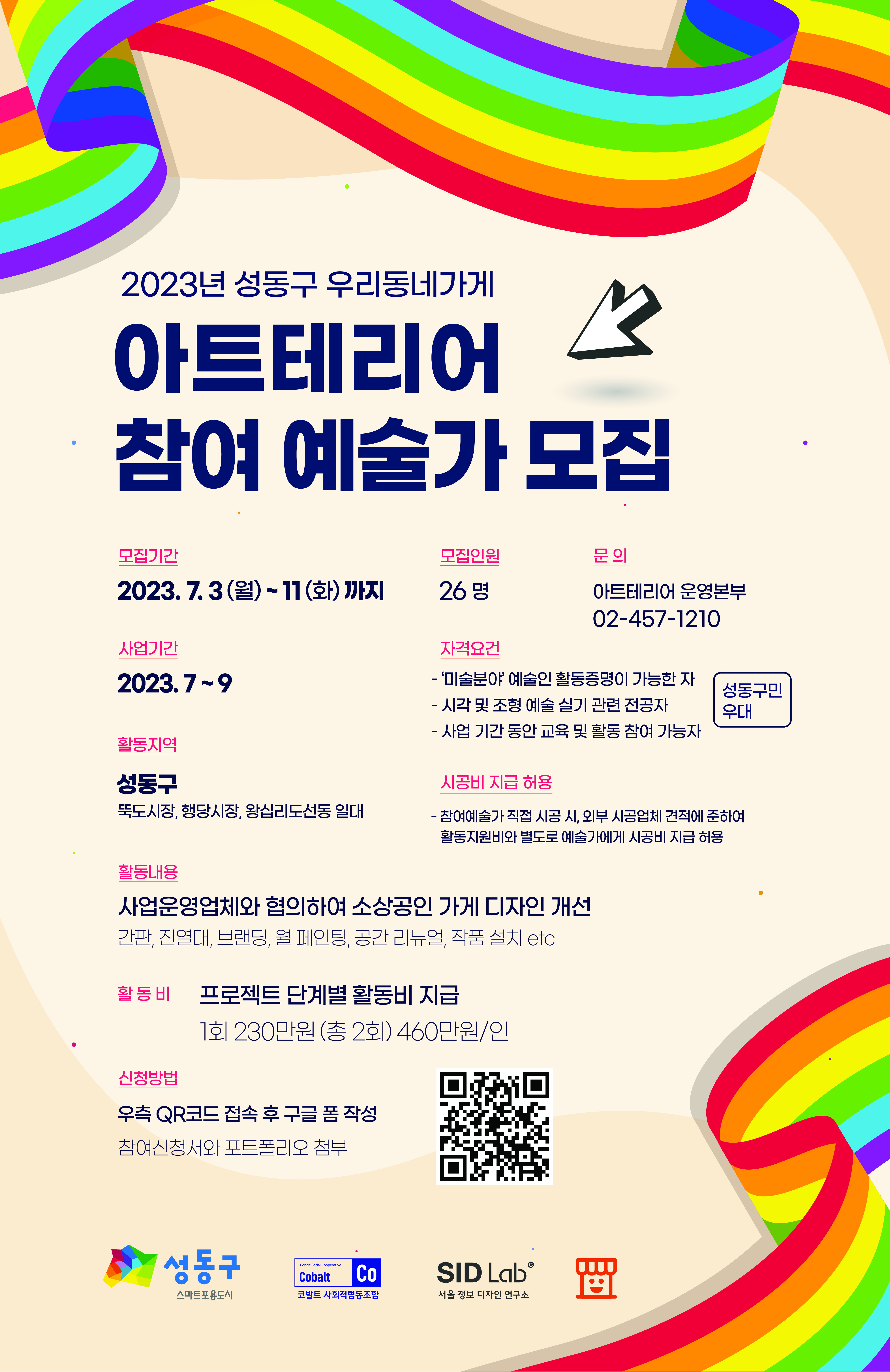 ![]() 안녕하십니까?2023년 성동구 아트테리어 사업에 참여할 예술가를 모집합니다. 서울에서 활동하시는 예술, 디자인 분야 전공자, 유관자 분들의 많은 참여 바랍니다. 1. 지원분야 및 모집인원 1) 일반참여예술가: 22명 - 미술, 디자인, 인테리어 분야 전문가 - 디자인, 아트웍을 통한 가게 환경 디자인 - 가게 탐방 > 디자인 시안 작업 > 디자인 구현, 설치 시공 - 1인 3~4개 점포 담당 2) 중간관리예술가: 4명 - 미술, 디자인, 인테리어 분야 전문가 - 대상 가게 또는 지역의 특성을 고려하여 아트테리어 콘셉트 등을 제안하고 일반참여예술가에게 디자인 관련 작업 지원 - 관련분야 경력 5년 이상 필요 2. 신청 자격 - 만 18세 이상 서울시민 혹은 서울소재 작업장 (성동구 거주자 우대) - 시각 및 조형 예술 실기 관련 전공자, 유관자 - 사업 기간 동안 교육 및 활동 참여 가능자 * 참여제한: 현재 취업상태인 자, 대학 또는 대학원에 재학중인자(단, 수료생, 졸업예정자는 가능) 3. 지원 내용: 230만원 씩 2회 활동비 지급(총 460만원) 4. 신청 방법 - 구글폼 작성 및 신청서, 포트폴리오 제출 - 신청링크 https://forms.gle/uUaKyj3LXJEcV74u8 5. 모집기간 - 2022. 7. 3.(월) ~ 7. 11.(화) - 결과안내 : 이메일 혹은 문자 개별 연락 6. 문의 - 전화 : 운영본부 02-457-1210 - 문의메일 : cobaltscoop@gmail.com 주최/주관 : 성동구청 지역경제과 시행사 : 코발트 사회적협동조합