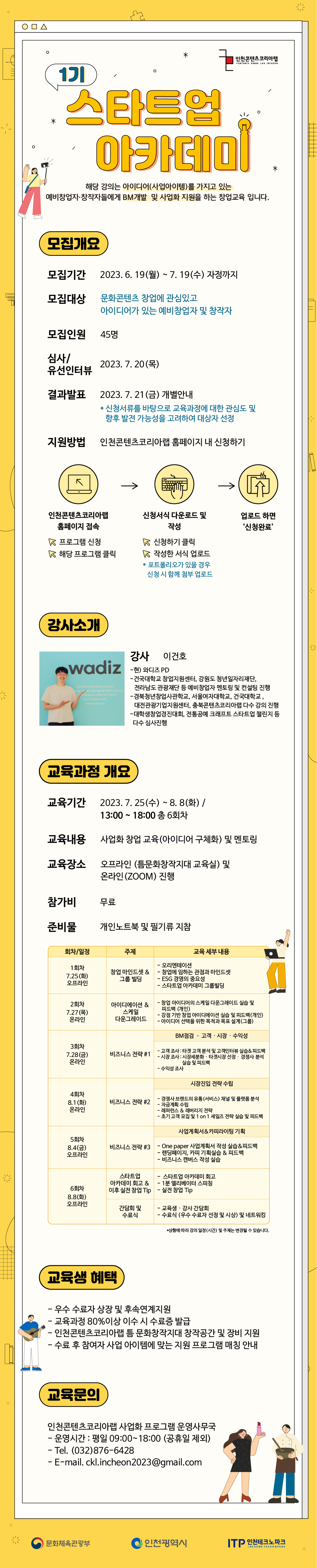 ▶ 모집대상 : 문화콘텐츠 창업에 관심있고 아이디어가 있는 예비창업자 및 창작자 ▶ 모집인원 : 45명 ▶ 신청하기 : 인천콘텐츠코리아랩 홈페이지 내 프로그램 신청 > '2023 스타트업 아카데미 1기 모집 (창업지원) 모집 연장공고' 클릭 > 신청서식 다운로드 및 작성 > 업로드 하면 '신청완료'
