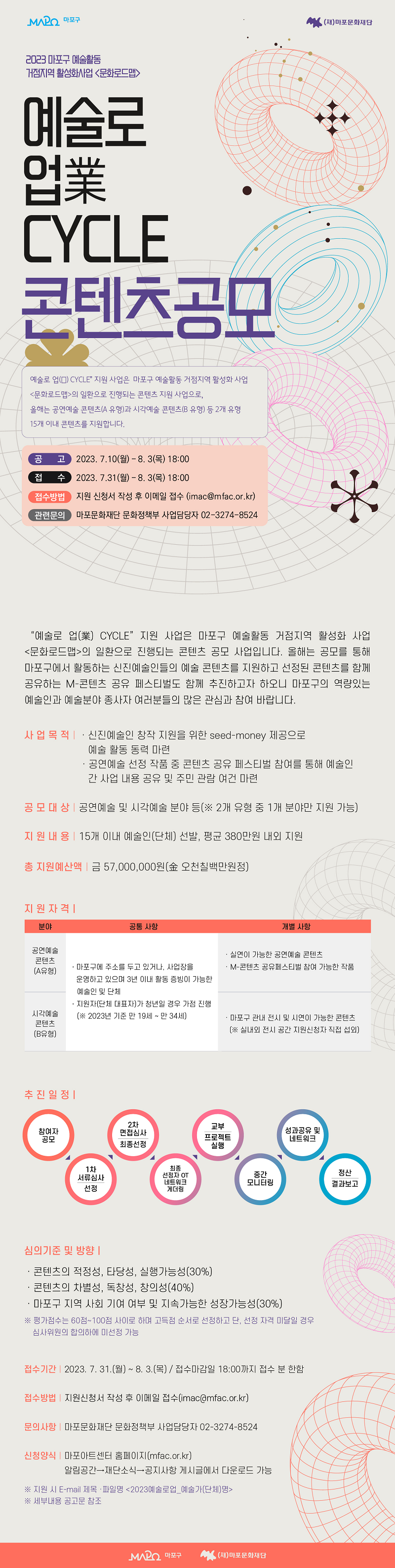 공고기간 : 2023년 7월 10일 (월) ~ 8월 3일 (목) 18:00 접수기간 : 2023년 7월 31일 (월) ~ 8월 3일 (목) 18:00 접수방법 : 지원 신청서 작성 후 이메일 접수 (imac@mfac.or.kr)