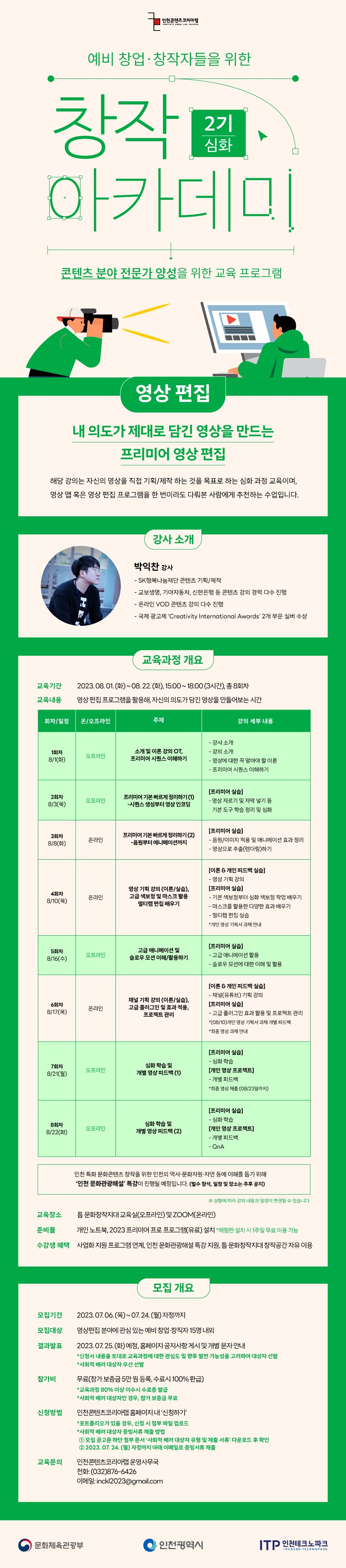 ▶ 모집기간: 2023. 07. 06. (목) ~ 07. 24. (월) 자정까지 ▶모집대상: 영상편집 분야에 관심 있는 예비 창업·창직자 15명 ▶ 신청하기: 인천콘텐츠코리아랩 홈페이지 내 신청하기 *사회적 배려 대상자 증빙서류 제출 방법 - 증빙서류는 모집공고문 하단의 별첨 문서 참조하여 이메일로 제출 - 제출 기한:2023. 07. 24. (월) 자정까지