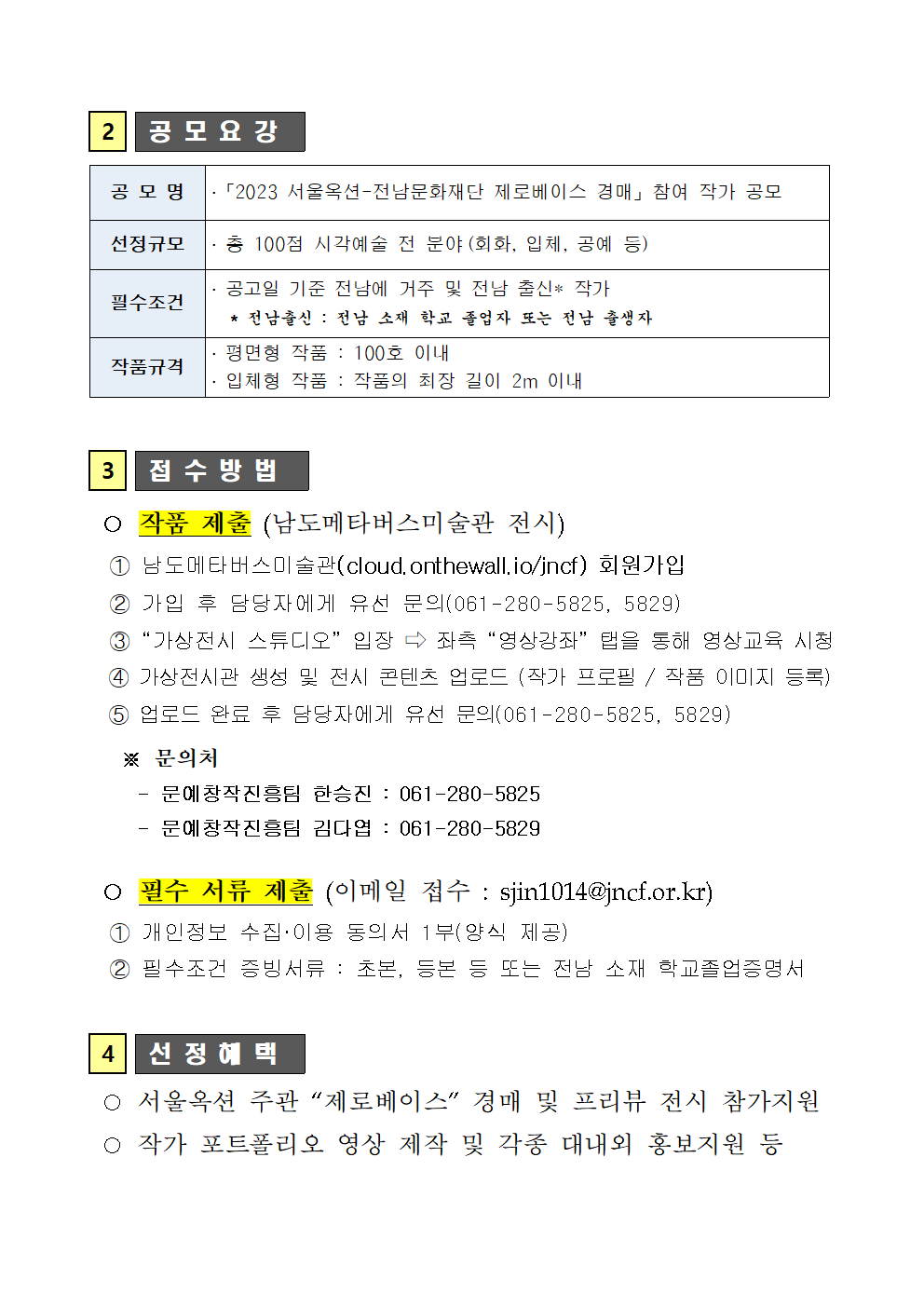 | sjin1014@jncf.or.kr | 전화번호 | 문예창작진흥팀 061-280-5825 / 061-280-5829 | |
