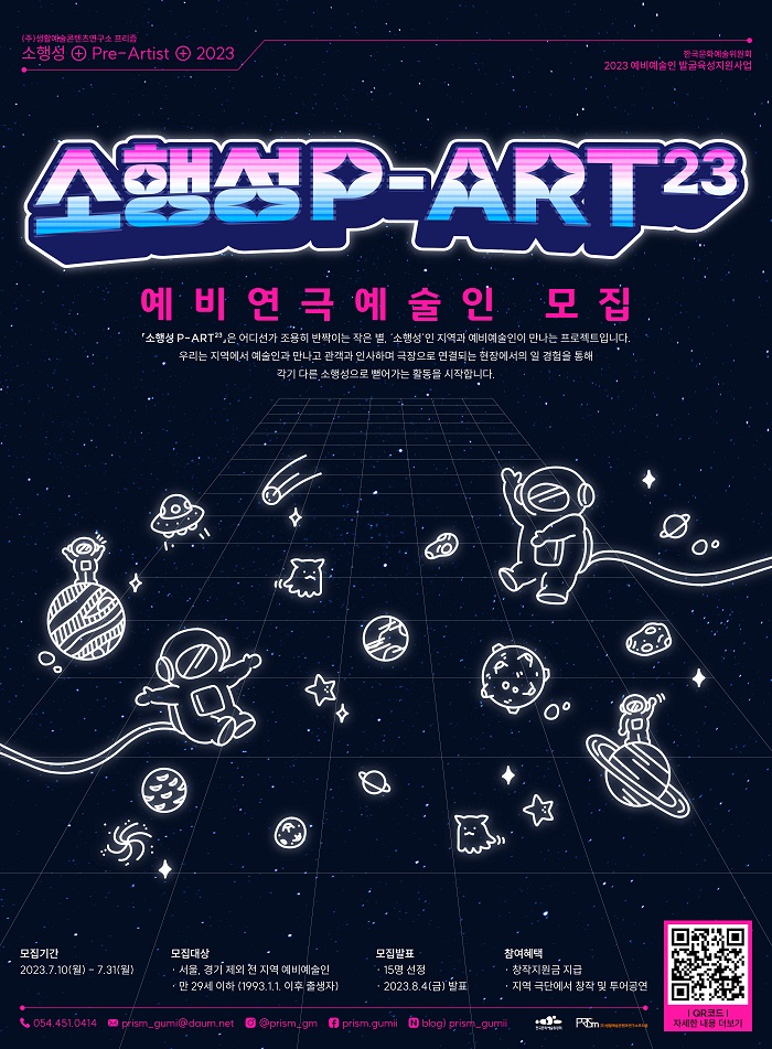 안녕하세요, (주)생활예술콘텐츠연구소프리즘에서 2023 예비예술인 발굴육성지원사업 '예비예술인, 지역을 무대로 종횡무진' 「소행성 P-ART²³」 참여 ⭐예비 연극예술인을 모집⭐합니다! ![]() ▶「소행성 P-ART²³」? 어디선가 조용히 반짝이는 작은 별, '소행성'인 지역과 예비예술인이 만나는 프로젝트입니다. 우리는 지역에서 예술인과 만나 관객과 인사하며 극장으로 연결되는 현장에서의 일 경험을 통해 각기 다른 소행성으로 뻗어가는 활동을 시작합니다. *소행성+Pre-ARTist+2023의 합성어로, 2023년에 작은 소행성인 지역과 예비예술인의 만남을 뜻하는 말 [활동 개요] ▶ 활동 기간 - 2023.8.8(화) ~ 12.2(토) ▶ 주요 활동지역 - 구미(소극장 공터다), 광주(씨어터 연바람) ▶ 활동 내용 - 창작(작품 창작, 창작공유회), 현장워크숍(현장예술인 교류), 공연(투어공연, 성과공유회) 등 예정 [모집 정보] ▶ 모집 기간 - 2023.7.10(월) ~ 7.31(월) ▶ 모집 대상 - 서울, 경기 제외 전 지역 예비예술인 - 만 29세 이하(1993.1.1. 이후 출생자)) ▶ 모집 발표 - 15명 선정(극작 2명, 연출 2명, 기획 2명, 배우 9명) - 2023.8. 4(금) 발표(SNS 게시 및 개별 연락 예정) ▶ 참여 혜택 - 창작지원금 지급, 지역 연극예술단체에서 창작활동 및 투어공연 ▶ 주최주관 - 생활예술콘텐츠연구소 프리즘 ▶ 협력운영 - (사)문화창작집단 공터다, 푸른연극마을 ▶ 후원 - 한국문화예술위원회 [신청 및 문의] ▶ 신청 방법 - 블로그에서 신청서 내려받아 작성 후, 메일 제출 *이메일: prism_gumi@daum.net ▶ 자세한 사항은 블로그 참고(아래 링크 연결 또는 포스터 내 QR코드 스캔) ▶ 문의: (주)생활예술콘텐츠연구소프리즘 - 전화) 054-451-0414 - 인스타그램) https://www.instagram.com/prism_gm/?hl=ko - 블로그) https://blog.naver.com/prism_gumii/223151865511