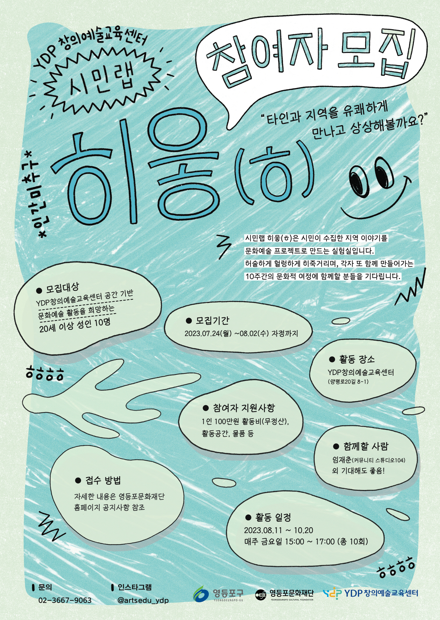 ○ 모집대상 : 공간 기반 문화예술 활동을 희망하는 20세 이상 성인 10명 내외 ○ 활동내용 : YDP창의예술교육센터에서 실행할 수 있는 프로젝트 탐색, 연구, 실험 ○ 활동일정 : 2023.8.11. ~ 10.20. 매주 금 15:00~17:00 (총 10회) ○ 참여자 지원사항 : 1인 100만원 활동비, 활동공간, 물품 등 ○ 신청방법 : '첨부2. 참여신청서' 작성 후 메일 제출 ▶️ tory@ydpcf.or.kr ○ 문의 : 02-3667-9063 (화~토 10:00~19:00)