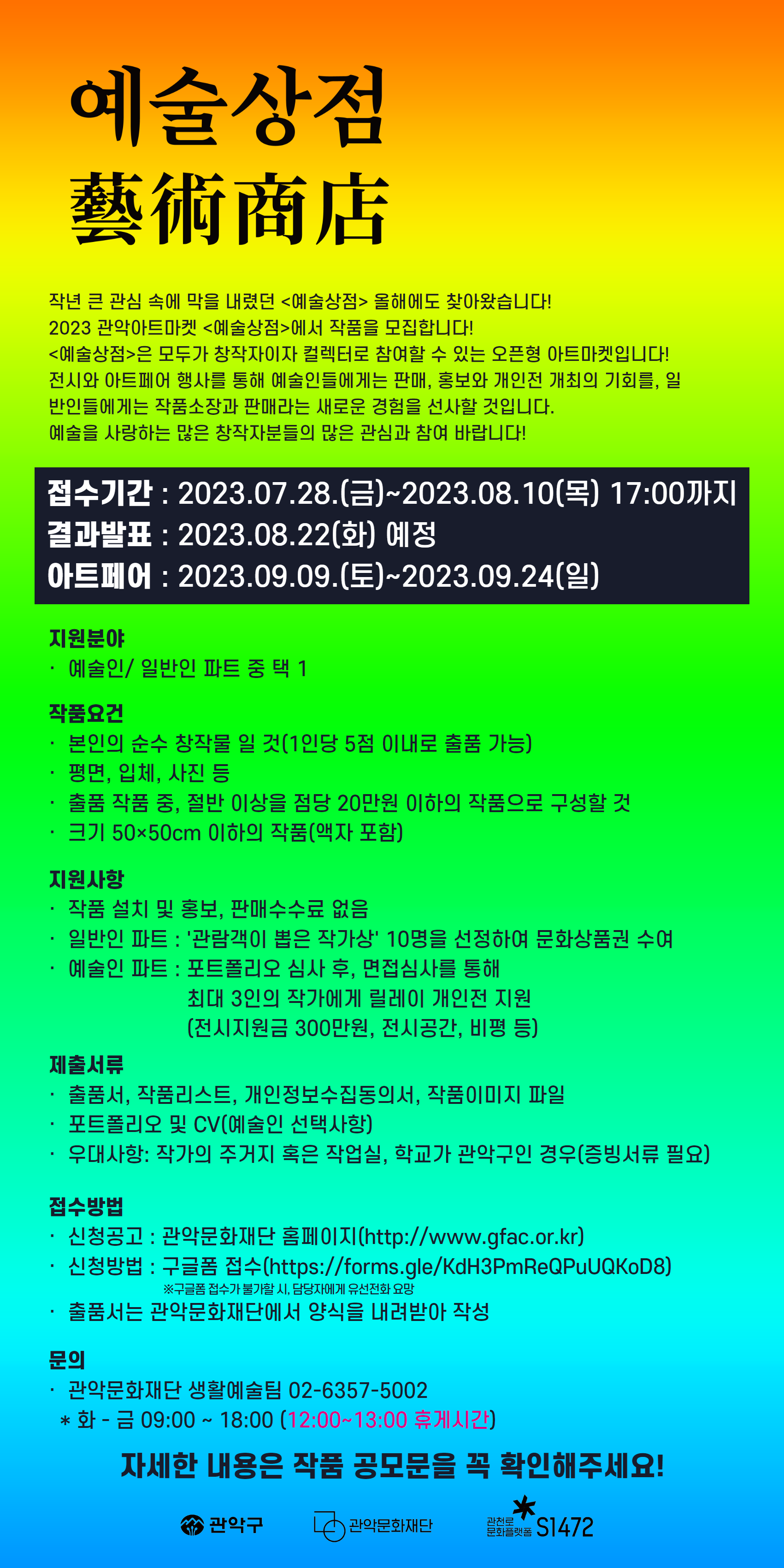 ![]() ![]() * 2023 관악아트마켓 <예술상점> 작품 공개 모집 * · 접수기간: 2023.07.28.(금)~2023.08.10(목) 17:00까지 · 결과발표: 2023.08.22.(화) 예정 · 아트페어 기간: 2023.09.09.(토)~2023.09.24(일)