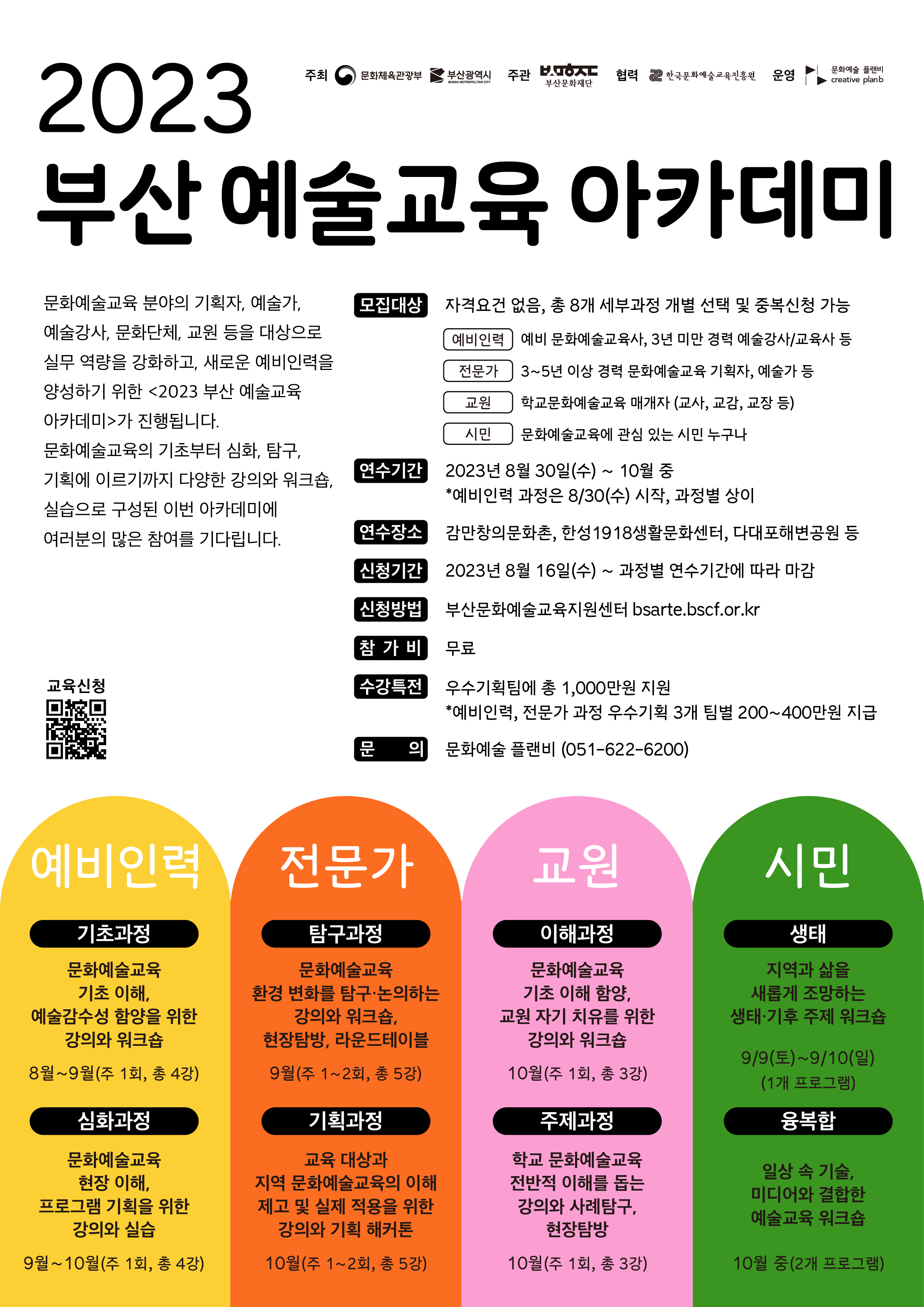 ![]() 문화예술교육 분야의 기획자, 예술가, 예술강사, 문화단체, 교원 등을 대상으로 실무역량을 강화하고, 새로운 예비인력을 양성하기 위한 <2023 부산 예술교육 아카데미>가 진행됩니다. 예비인력[기초/심화] 과정은 문화예술교육 입문자, 3년 미만 경력의 기획자 및 예술강사 등 문화예술교육 예비인력에게 추천하는 과정으로, 문화예술교육의 기초와 현장에 대한 강의와 워크숍, 교육 프로그램 기획에 대한 강의와 기획실습으로 구성됩니다. 예비인력을 비롯하여 이론부터 기획까지 기초 역량을 강화하고 싶은 현장인력 여러분의 많은 관심과 참여 바랍니다. ㅇ연수기간: 2023년 8월 30일(수) ~ 10월 14일(토) (기초) 8월 30일(수) ~ 9월 20일(수) (심화) 9월 8일(금) ~ 10월 14일(토) ㅇ교육장소: 감만창의문화촌 배움방2, 나눔방 ㅇ모집기간: 2023년 8월 16일(수) ~ 8월 28일(월) ㅇ모집대상: 자격요건 없음, 세부과정 개별 및 중복신청 가능 ㅇ수강특전: 우수기획팀 지원금 최대 2~4백만원 지급 (예비인력 총 1개팀, 기초+심화과정 수료 및 실습 참여 필수) ㅇ참가비: 무료 ㅇ신청방법: 부산문화예술교육 온라인 플랫폼(bsarte.bscf.or.kr) ㅇ문의: 운영기관(문화예술 플랜비 051-622-6200) *신청확인 및 교육안내 등은 8/28(월)에 문자로 일괄 안내 예정입니다.