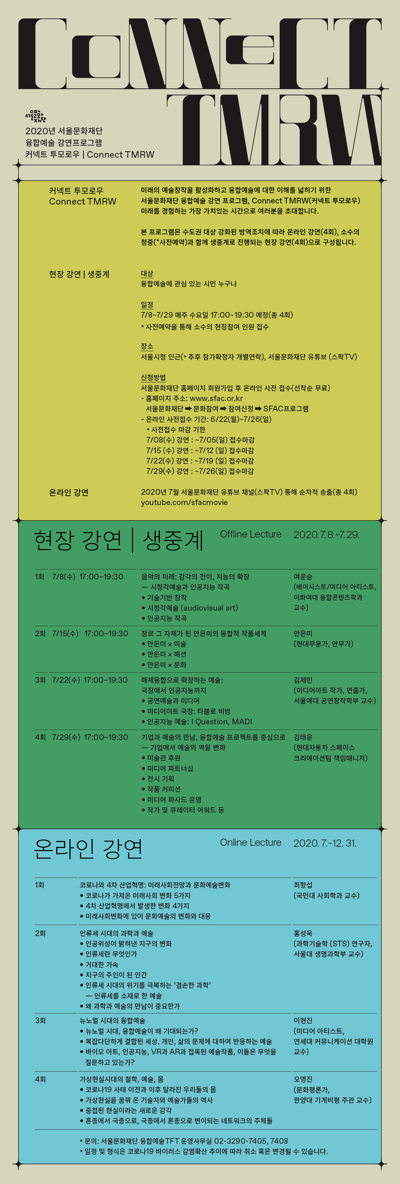서울문화재단에서 융합예술에 대한 이해 향상을 위한 강연 프로그램 커넥트 투모로우를 운영합니다. 현장 뿐 아니라 온라인 생중계및 온라인 강연을 병행할 예정이오니 관심있는 분들은 참고 및 신청 바랍니다.