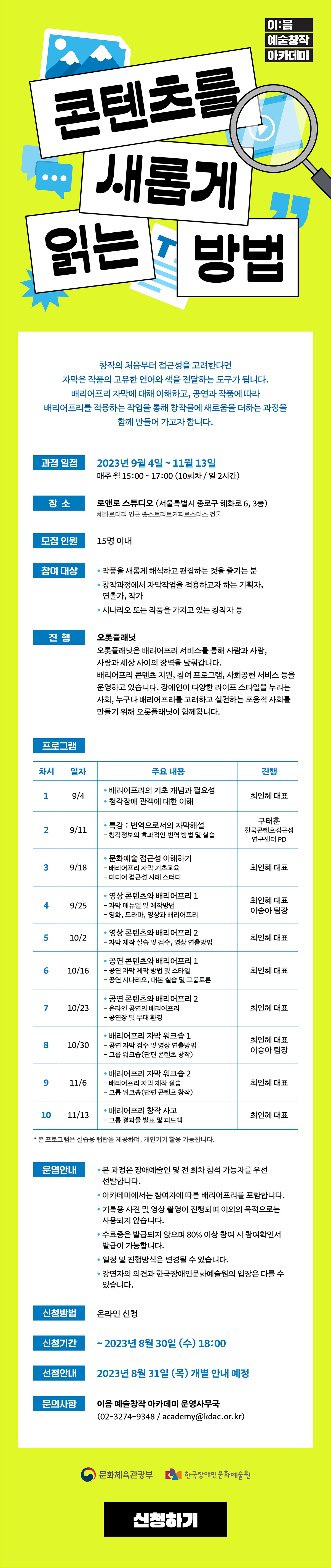 | 분야·대상 | 배리어프리에 관심이 있는 기획자, 연출가, 작가, 창작자 등 | 인원 | 15명 이내 |