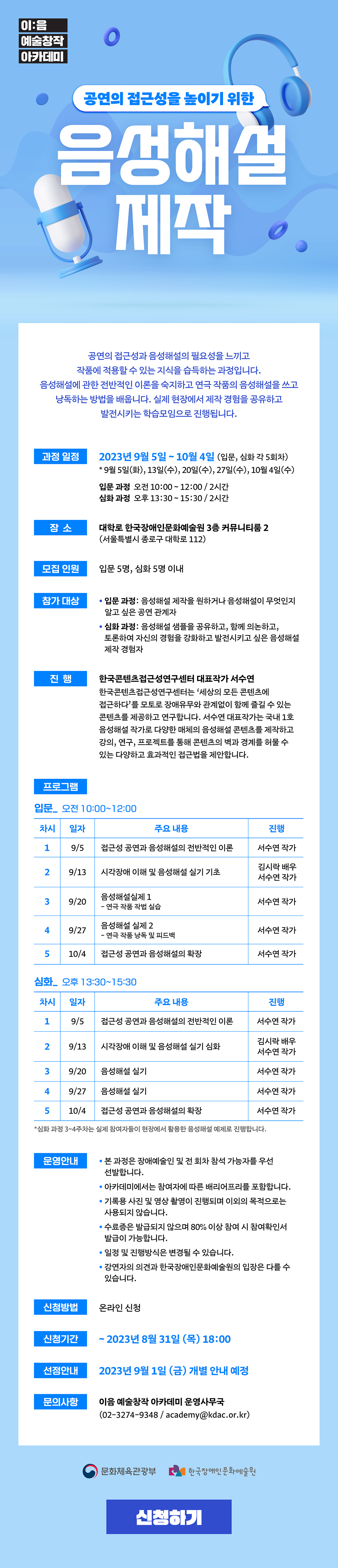 | 분야·대상 | 음성 해설 제작을 원하거나 무엇인지 알고 싶은 공연 관계자, 음성해설 샘플을 공유하고 의논, 토론하며 자신의 경험을 강화, 발전 시키고 싶은 음성해설 제작 경험자 | 인원 | 입문 5명, 심화 5명 이내 |