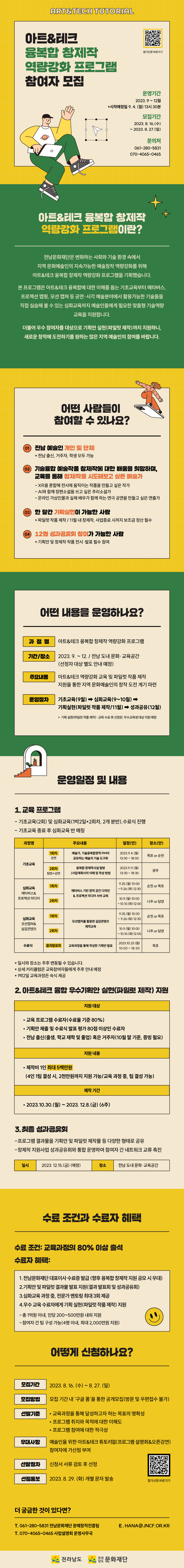 | HANA@JNCF.OR.KR | 전화번호 | 전남 문화재단 문예창작진흥팀 061-280-5831 / 사업설명회 운영사무국 070-4056-0465 | |