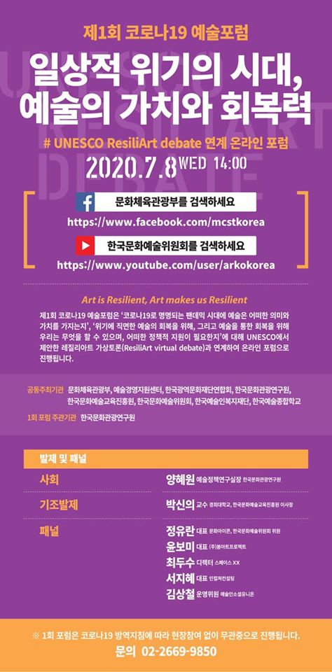 | [2020.07.08] 제1회 코로나19 예술포럼 - 온라인생중계 예정 | |||||