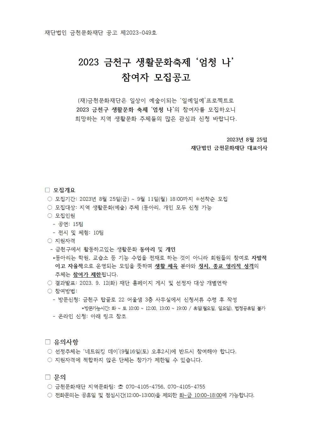 | 2023 금천구 생활문화축제 '엄청 나' 참여자 모집 | |||