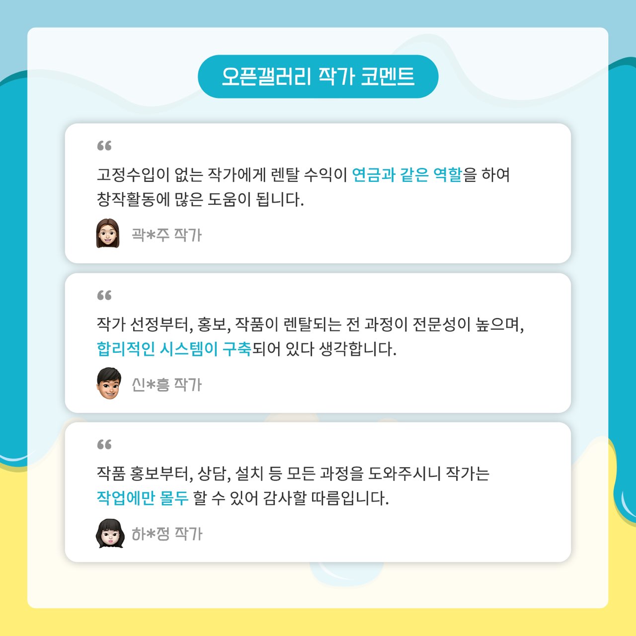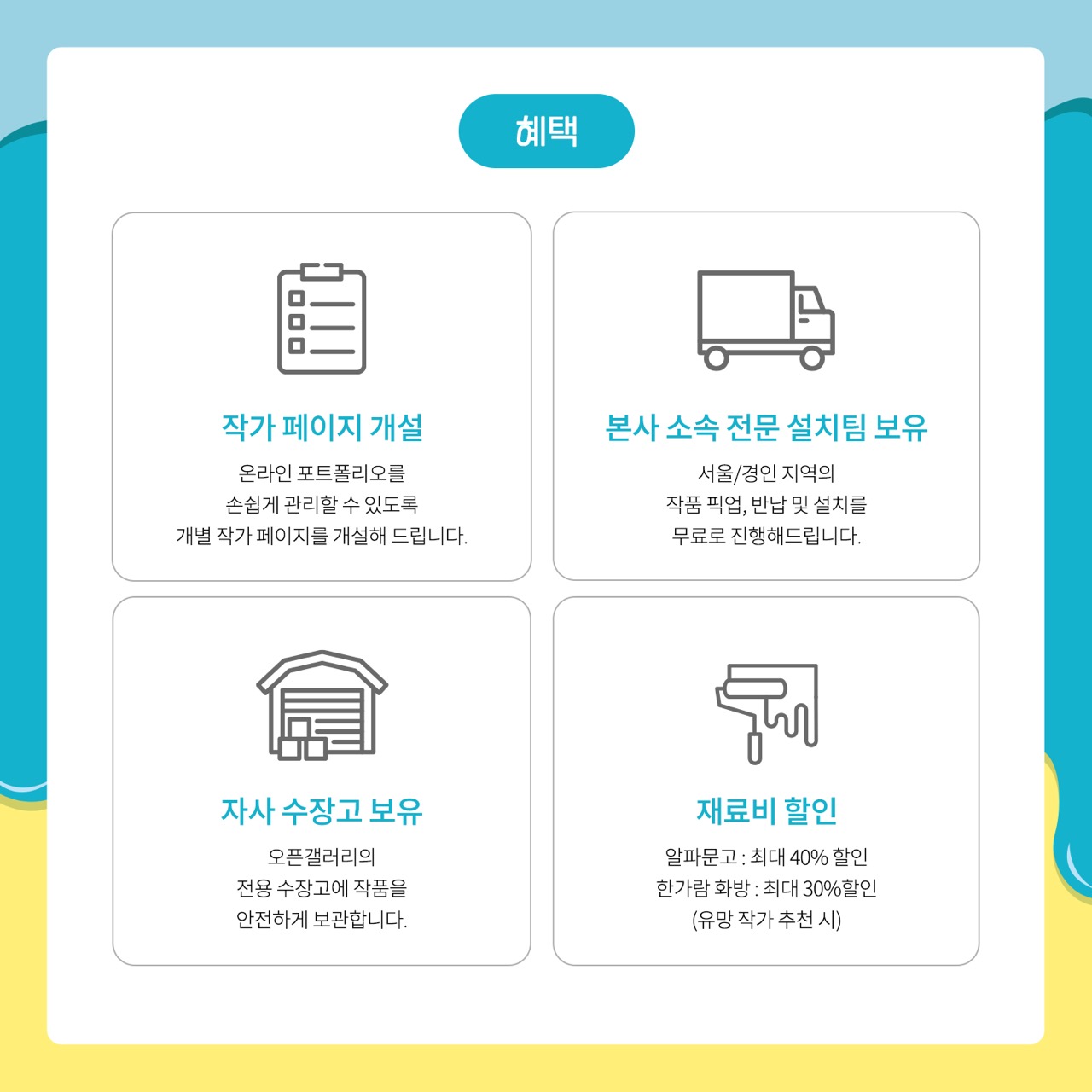 오픈갤러리는 더 나은 미술 생태계를 함께 이끌어 나갈 작가님들을 기다리고 있습니다. ▷ 오픈갤러리 소개 https://www.opengallery.co.kr/about/ 1. 모집 분야