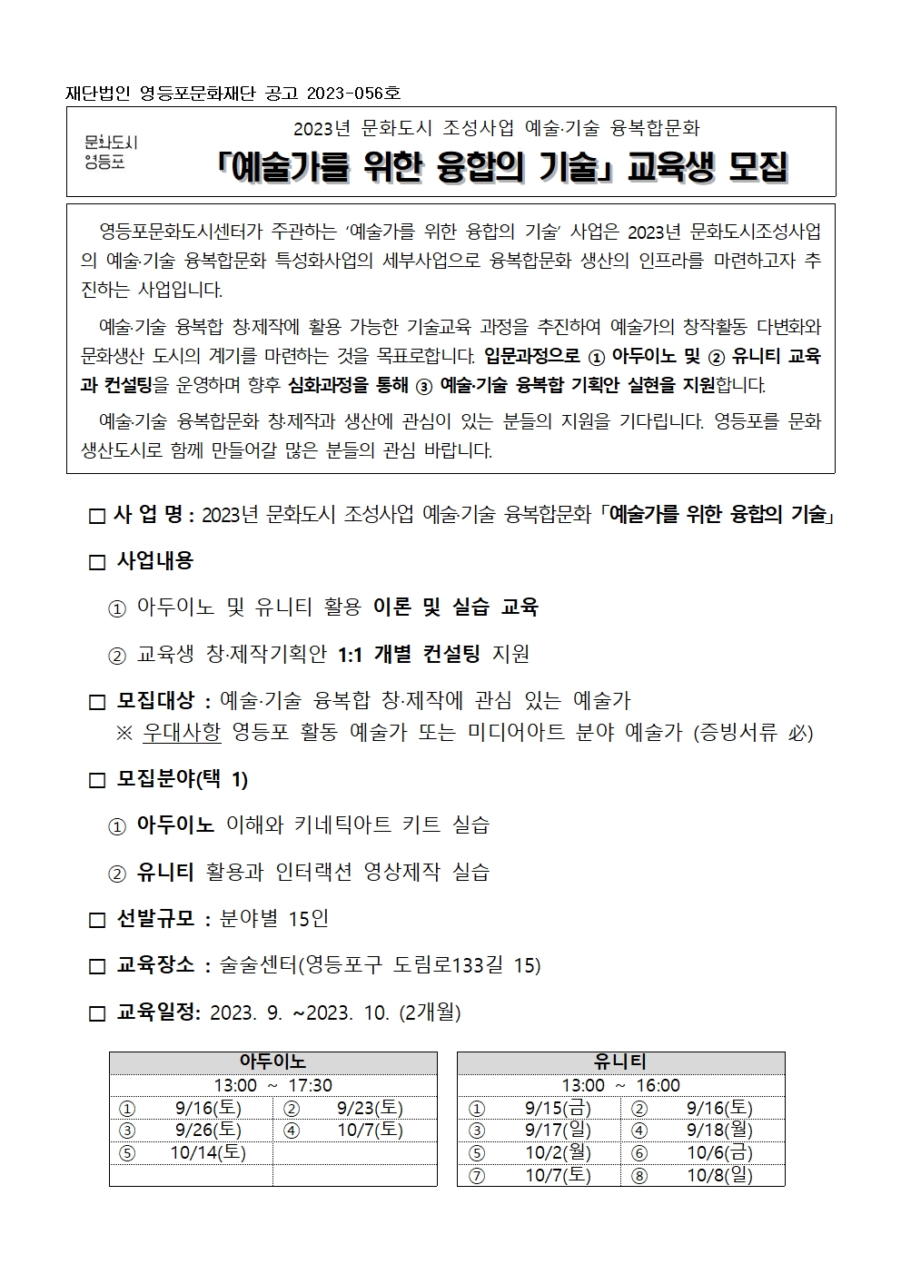 | 2023 「예술가를 위한 융합의 기술」 교육생 모집 (~9.7.) | |||