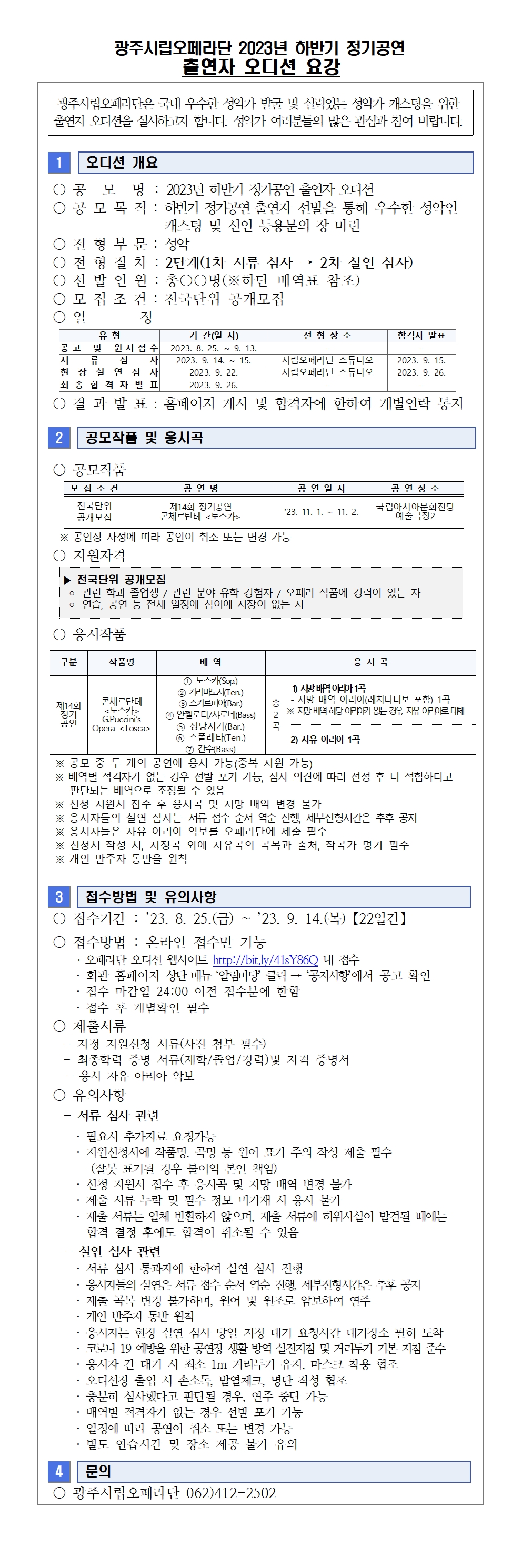 | 광주시립오페라단 2023년 하반기 정기공연(토스카) 출연자 오디션 | |||