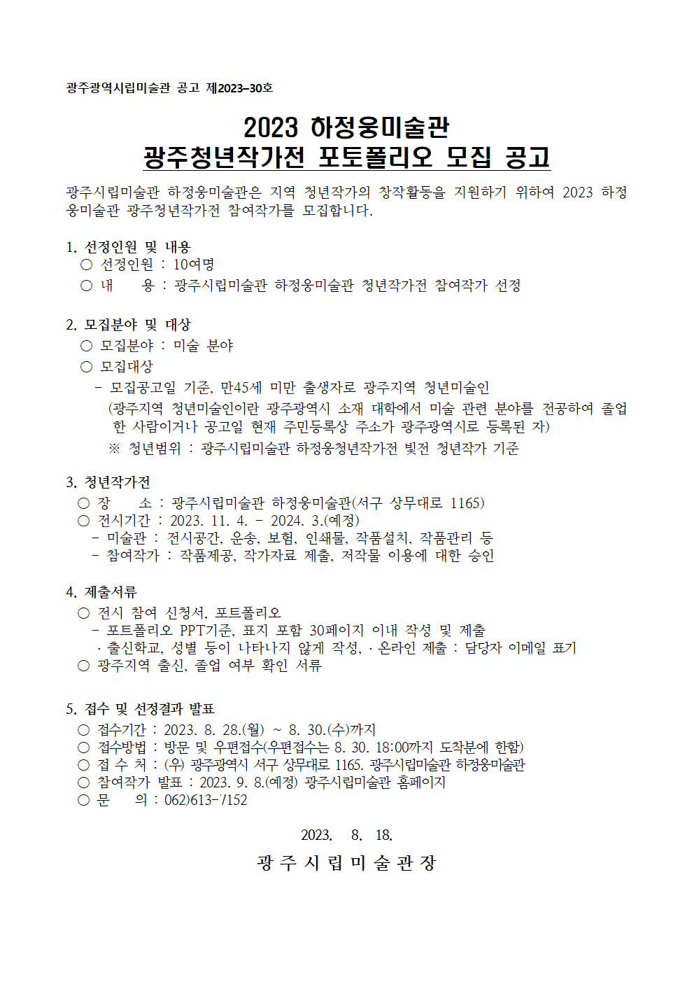 | 광주시립미술관 하정웅미술관 광주청년작가전 포토폴리오 참여작가 모집 | |||